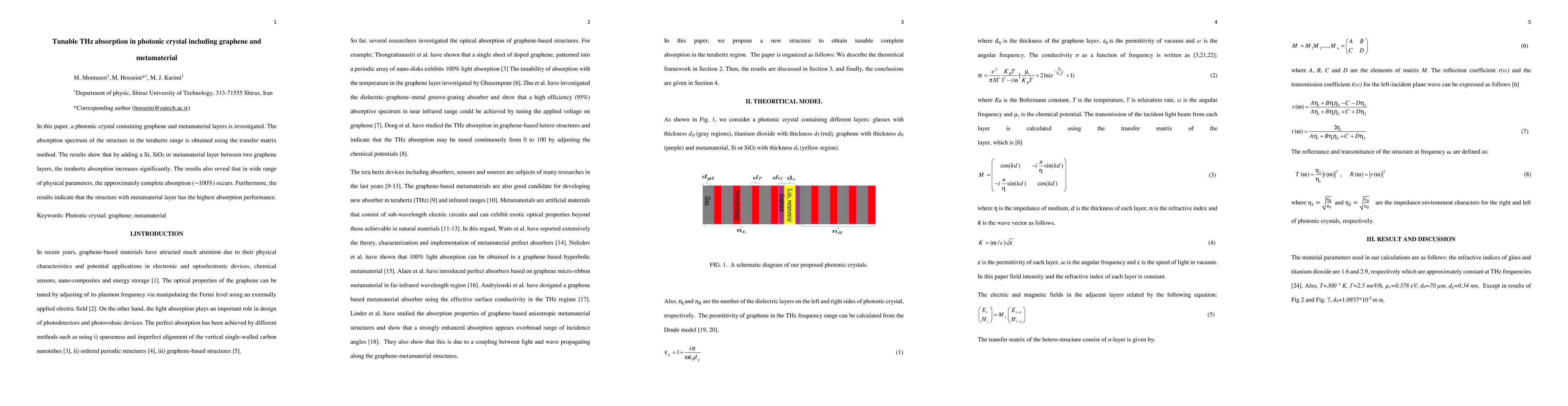 This paper investigates a photonic crystal with integrated graphene and metamaterial layers, demonstrating that adding Si, SiO2, or a metamaterial layer between graphene layers significantly enhances terahertz absorption. The study finds that the structure with a metamaterial layer achieves the highest absorption performance across a wide range of physical parameters.