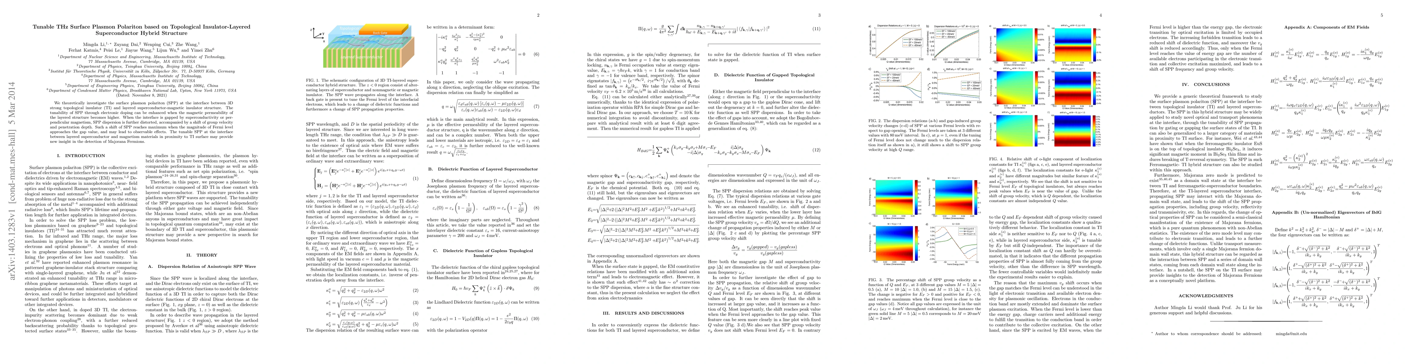 This paper explores the tunable THz surface plasmon polariton (SPP) at the interface between a 3D topological insulator and a layered superconductor-magnetic insulator. The study finds that electronic doping enhances SPP tunability, with significant shifts in group velocity and penetration depth when the interface is gapped by superconductivity or perpendicular magnetism, potentially aiding in the detection of Majorana Fermions.