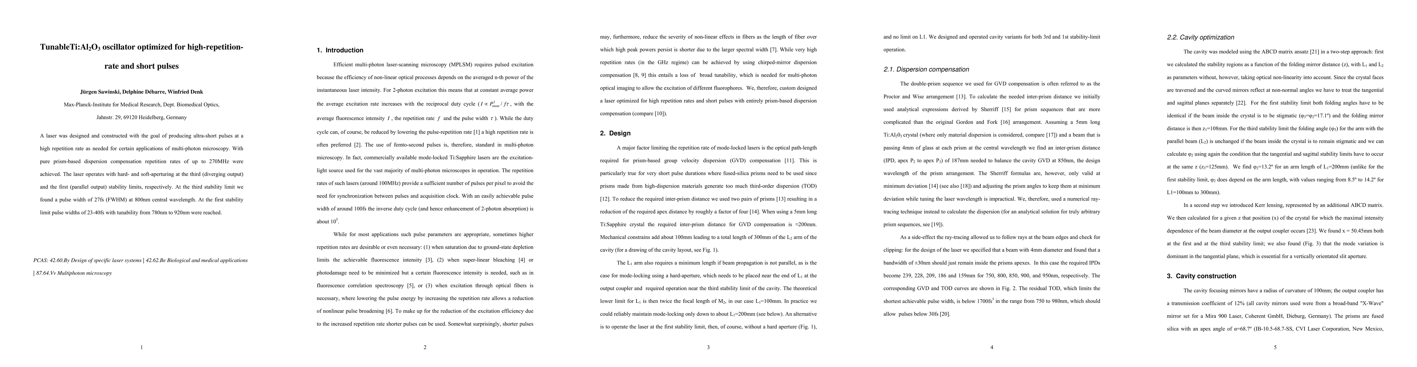 A Ti:Al2O3 oscillator was developed to generate ultra-short pulses at high repetition rates for multi-photon microscopy, achieving up to 270MHz with prism-based dispersion compensation. The laser demonstrated pulse widths of 27fs at the third stability limit and 23-40fs tunability from 780nm to 920nm at the first stability limit.