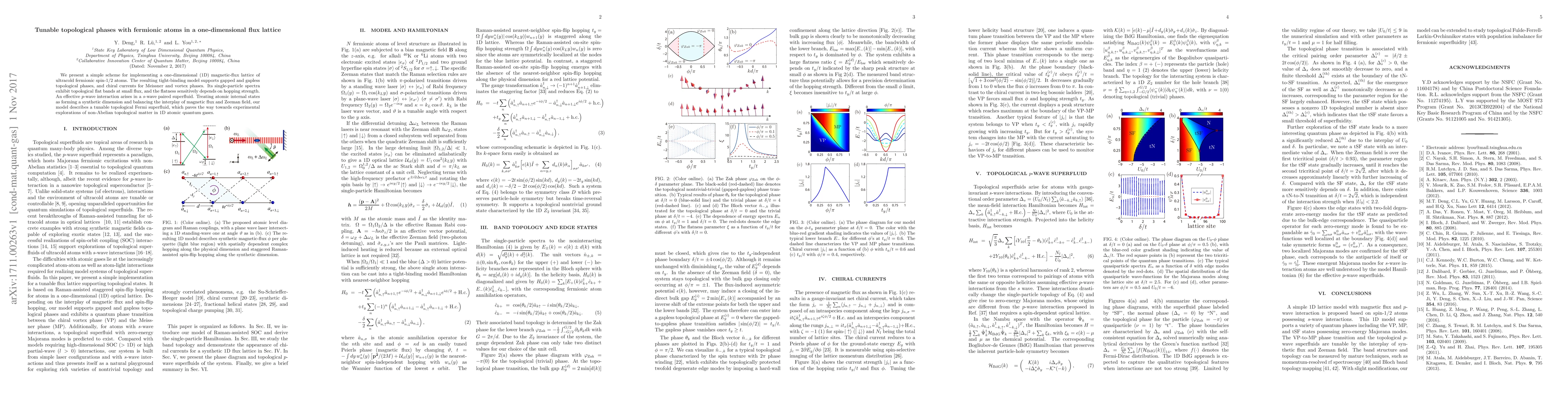 We present a simple scheme for implementing a one-dimensional (1D) magnetic-flux lattice of ultracold fermionic spin-$1/2$ atoms. The resulting tight-binding model supports gapped and gapless topological phases, and chiral currents for Meissner and vortex phases. Its single-particle spectra exhibit topological flat bands at small flux, and the flatness sensitively depends on hopping strength. An effective $p$-wave interaction arises in a $s$-wave paired superfluid. Treating atomic internal states as forming a synthetic dimension and balancing the interplay of magnetic flux and Zeeman field, our model describes a tunable topological Fermi superfluid, which paves the way towards experimental explorations of non-Abelian topological matter in 1D atomic quantum gases.