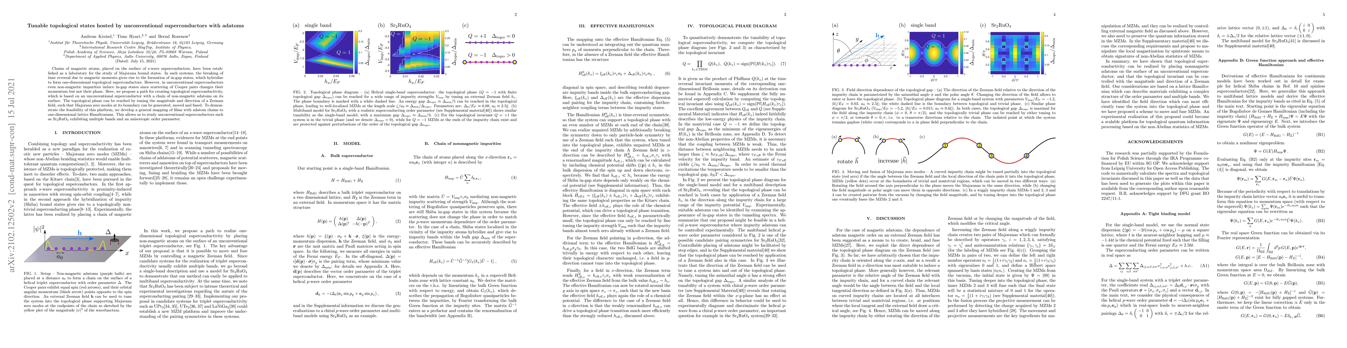 Chains of magnetic atoms, placed on the surface of s-wave superconductors, have been established as a laboratory for the study of Majorana bound states. In such systems, the breaking of time reversal due to magnetic moments gives rise to the formation of in-gap states, which hybridize to form one-dimensional topological superconductors. However, in unconventional superconductors even non-magnetic impurities induce in-gap states since scattering of Cooper pairs changes their momentum but not their phase. Here, we propose a path for creating topological superconductivity, which is based on an unconventional superconductor with a chain of non-magnetic adatoms on its surface. The topological phase can be reached by tuning the magnitude and direction of a Zeeman field, such that Majorana zero modes at its boundary can be generated, moved and fused. To demonstrate the feasibility of this platform, we develop a general mapping of films with adatom chains to one-dimensional lattice Hamiltonians. This allows us to study unconventional superconductors such as Sr$_2$RuO$_4$ exhibiting multiple bands and an anisotropic order parameter.