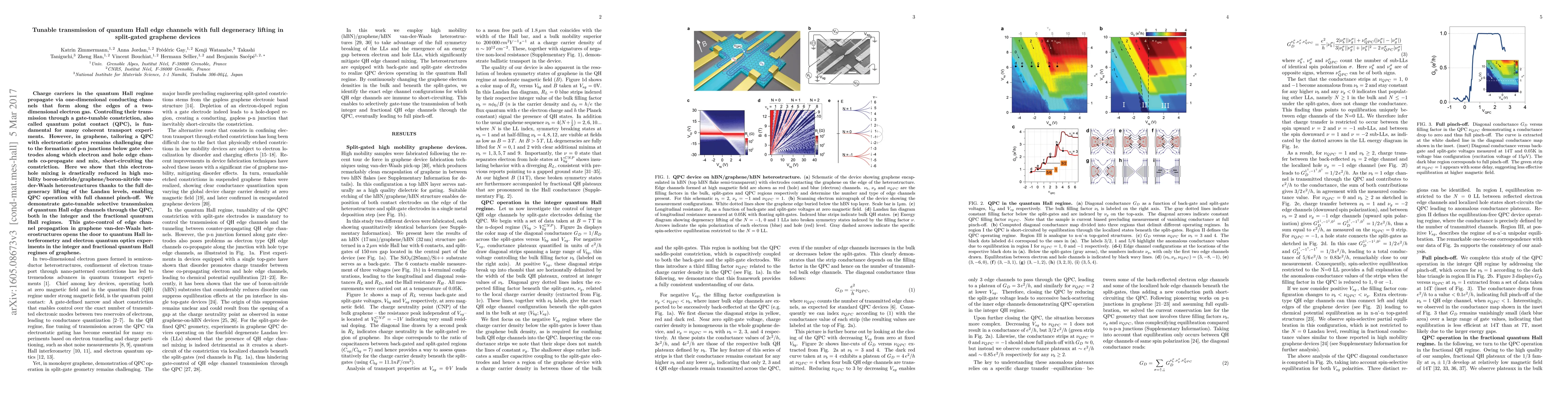 This paper demonstrates tunable transmission of quantum Hall edge channels in split-gated graphene devices, facilitated by full degeneracy lifting in boron-nitride/graphene/boron-nitride heterostructures, enabling QPC operation with full channel pinch-off and gate-controlled propagation in both integer and fractional quantum Hall regimes.