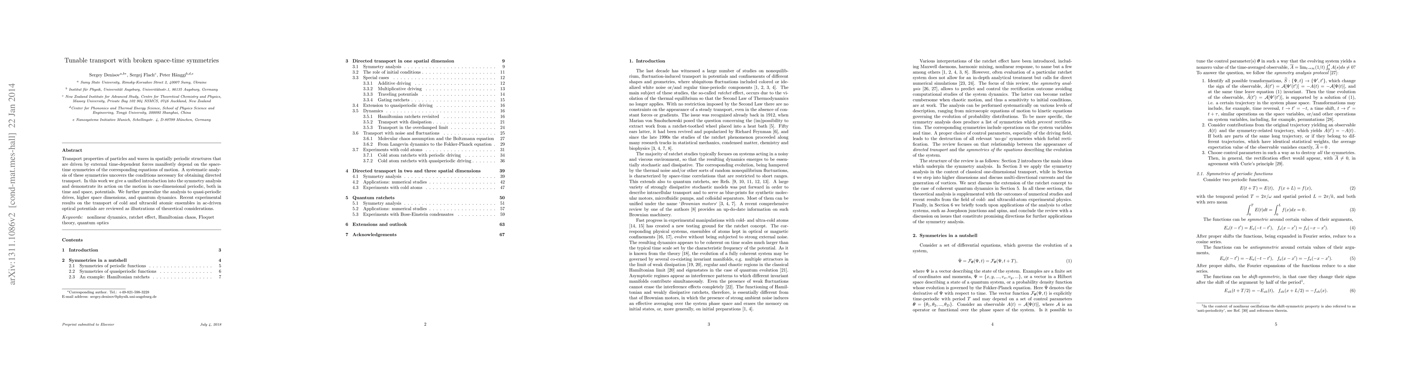 Transport properties of particles and waves in spatially periodic structures that are driven by external time-dependent forces manifestly depend on the space-time symmetries of the corresponding equations of motion. A systematic analysis of these symmetries uncovers the conditions necessary for obtaining directed transport. In this work we give a unified introduction into the symmetry analysis and demonstrate its action on the motion in one-dimensional periodic, both in time and space, potentials. We further generalize the analysis to quasi-periodic drivings, higher space dimensions, and quantum dynamics. Recent experimental results on the transport of cold and ultracold atomic ensembles in ac-driven optical potentials are reviewed as illustrations of theoretical considerations.