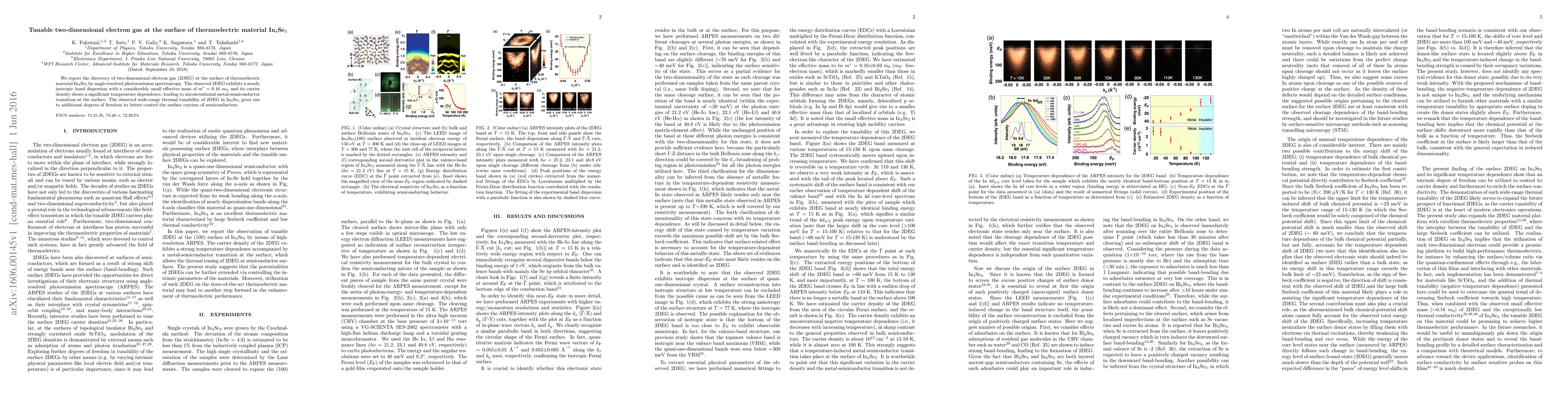 We report the discovery of two-dimensional electron gas (2DEG) at the surface of thermoelectric material In$_4$Se$_3$ by angle-resolved photoemission spectroscopy. The observed 2DEG exhibits a nearly isotropic band dispersion with a considerably small effective mass of m* = 0.16 m_0, and its carrier density shows a significant temperature dependence, leading to unconventional metal-semiconductor transition at the surface. The observed wide-range thermal tunability of 2DEG in In$_4$Se$_3$ gives rise to additional degrees of freedom to better control the surface carriers of semiconductors.