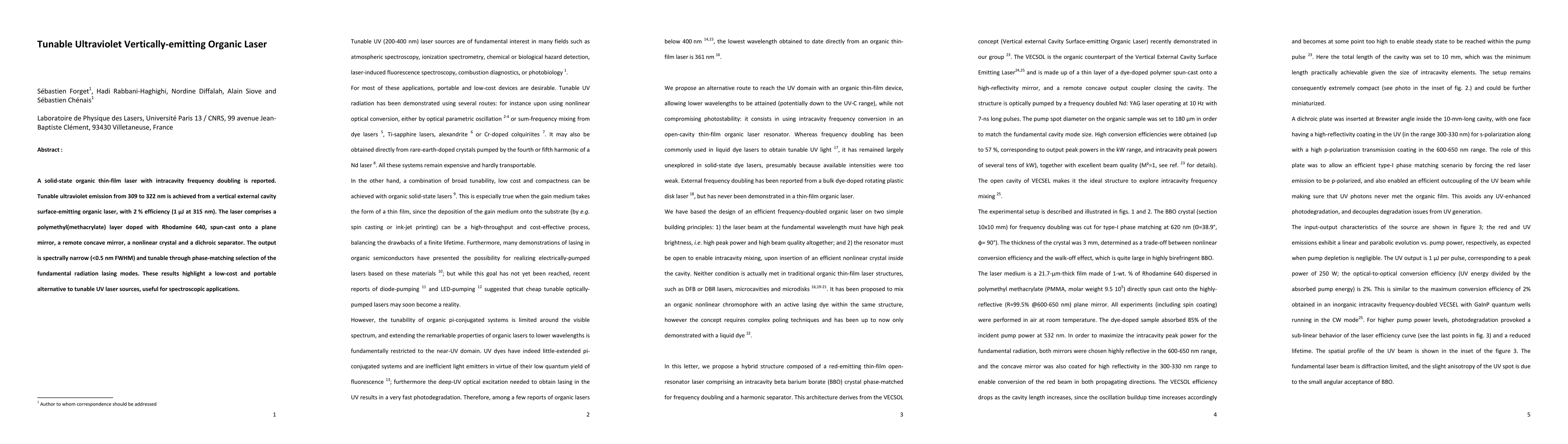 This research reports a solid-state organic thin-film laser with intracavity frequency doubling, achieving tunable ultraviolet emission from 309 to 322 nm. The laser design includes a polymethyl(methacrylate) layer doped with Rhodamine 640, offering a low-cost and portable alternative for spectroscopic applications.