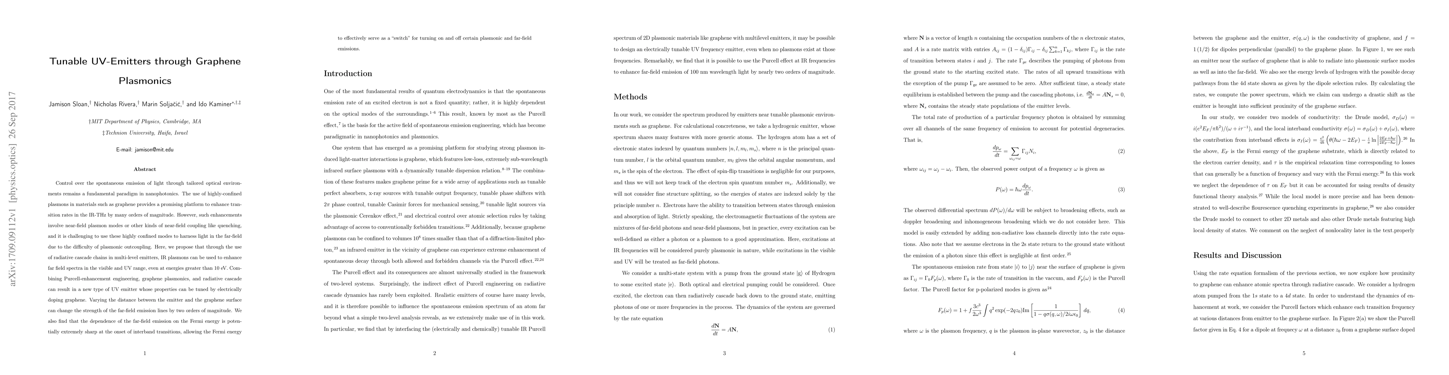 Control over the spontaneous emission of light through tailored optical environments remains a fundamental paradigm in nanophotonics. The use of highly-confined plasmons in materials such as graphene provides a promising platform to enhance transition rates in the IR-THz by many orders of magnitude. However, such enhancements involve near-field plasmon modes or other kinds of near-field coupling like quenching, and it is challenging to use these highly confined modes to harness light in the far-field due to the difficulty of plasmonic outcoupling. Here, we propose that through the use of radiative cascade chains in multi-level emitters, IR plasmons can be used to enhance far field spectra in the visible and UV range, even at energies greater than 10 eV. Combining Purcell-enhancement engineering, graphene plasmonics, and radiative cascade can result in a new type of UV emitter whose properties can be tuned by electrically doping graphene. Varying the distance between the emitter and the graphene surface can change the strength of the far-field emission lines by two orders of magnitude. We also find that the dependence of the far-field emission on the Fermi energy is potentially extremely sharp at the onset of interband transitions, allowing the Fermi energy to effectively serve as a "switch" for turning on and off certain plasmonic and far-field emissions.