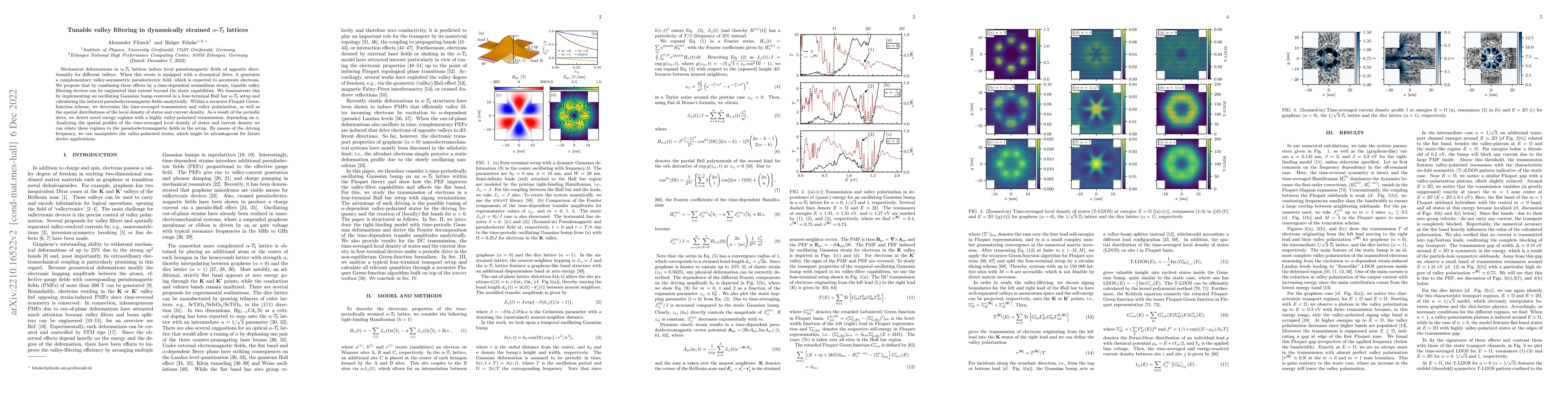 This paper proposes tunable valley filtering in dynamically strained $\alpha$-$\mathcal{T}_3$ lattices, where mechanical deformations generate a valley-asymmetric pseudoelectric field. The study demonstrates this effect through an oscillating Gaussian bump in a four-terminal Hall bar setup, showing novel energy regimes with highly valley-polarized transmission that can be manipulated by the driving frequency.
