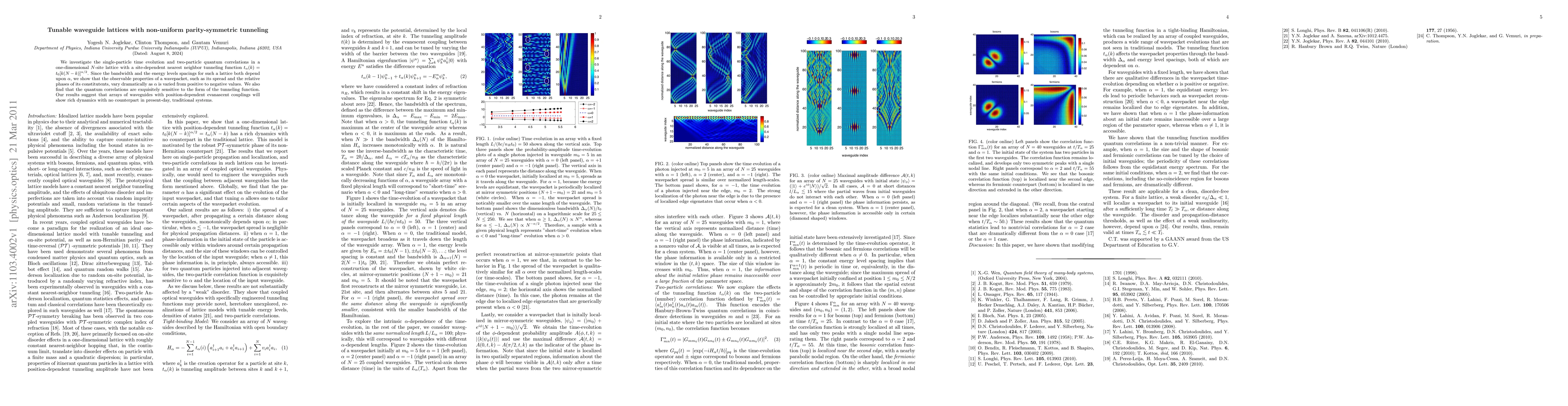 We investigate the single-particle time evolution and two-particle quantum correlations in a one-dimensional $N$-site lattice with a site-dependent nearest neighbor tunneling function $t_\alpha(k)=t_0[k(N-k)]^{\alpha/2}$. Since the bandwidth and the energy levels spacings for such a lattice both depend upon $\alpha$, we show that the observable properties of a wavepacket, such as its spread and the relative phases of its constitutents, vary dramatically as $\alpha$ is varied from positive to negative values. We also find that the quantum correlations are exquisitely sensitive to the form of the tunneling function. Our results suggest that arrays of waveguides with position-dependent evanascent couplings will show rich dynamics with no counterpart in present-day, traditional systems.