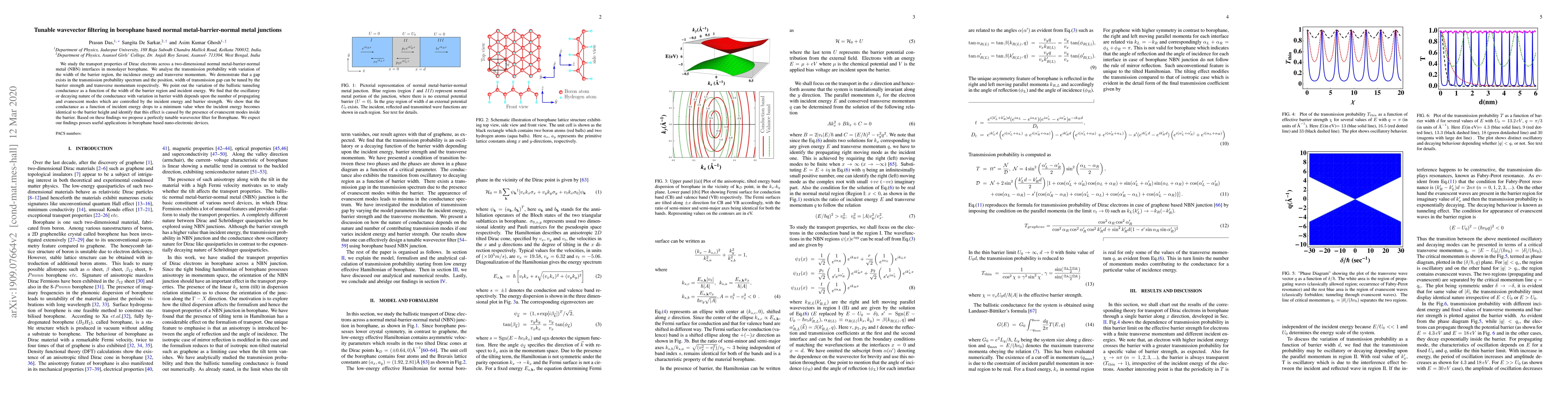 We study the transport properties of Dirac electrons across a two-dimensional normal metal-barrier-normal metal (NBN) interfaces in monolayer borophane. We analyse the transmission probability with variation of the width of the barrier region, the incidence energy and transverse momentum. We demonstrate that a gap exists in the transmission probability spectrum and the position, width of transmission gap can be tuned by the barrier strength and transverse momentum respectively. We point out the variation of the ballistic tunneling conductance as a function of the width of the barrier region and incident energy. We find that the oscillatory or decaying nature of the conductance with variation in barrier width depends upon the number of propagating and evanescent modes which are controlled by the incident energy and barrier strength. We show that the conductance as a function of incident energy drops to a minimum value when the incident energy becomes identical to the barrier height and identify that this effect is caused by the presence of evanescent modes inside the barrier. Based on these findings we propose a perfectly tunable wavevector filter for Borophane. We expect our findings posses useful applications in borophane based nano-electronic devices.