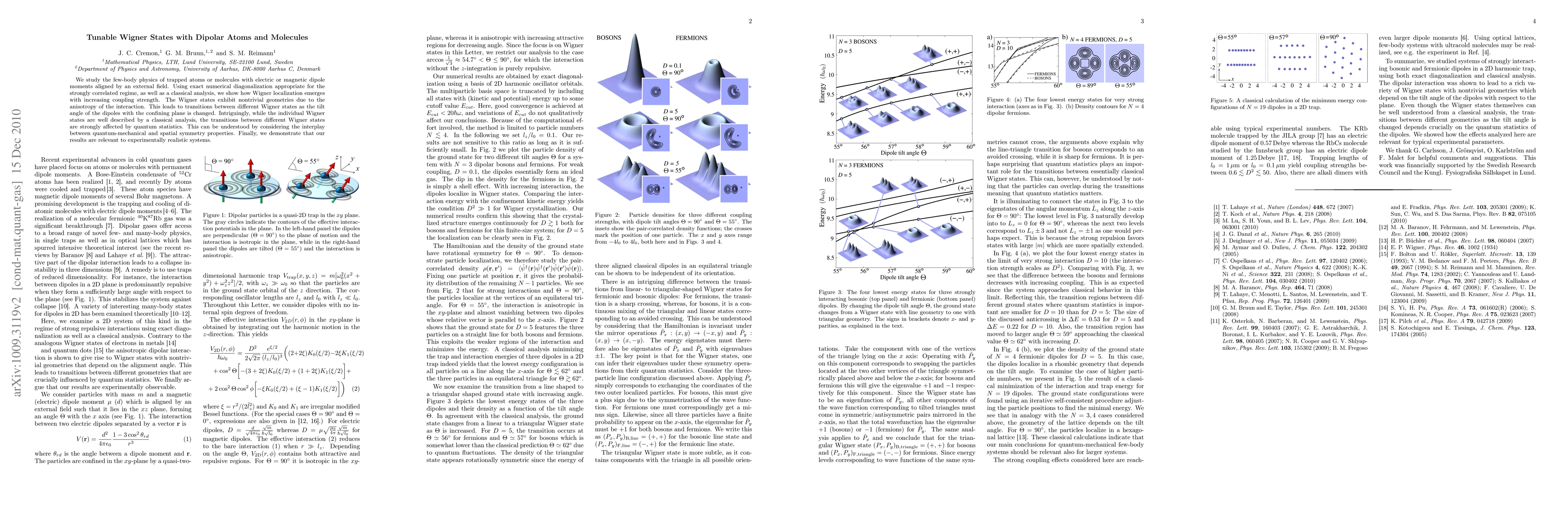 We study the few-body physics of trapped atoms or molecules with electric or magnetic dipole moments aligned by an external field. Using exact numerical diagonalization appropriate for the strongly correlated regime, as well as a classical analysis, we show how Wigner localization emerges with increasing coupling strength. The Wigner states exhibit non-trivial geometries due to the anisotropy of the interaction. This leads to transitions between different Wigner states as the tilt angle of the dipoles with the confining plane is changed. Intriguingly, while the individual Wigner states are well described by a classical analysis, the transitions between different Wigner states are strongly affected by quantum statistics. This can be understood by considering the interplay between quantum-mechanical and spatial symmetry properties. Finally, we demonstrate that our results are relevant to experimentally realistic systems.