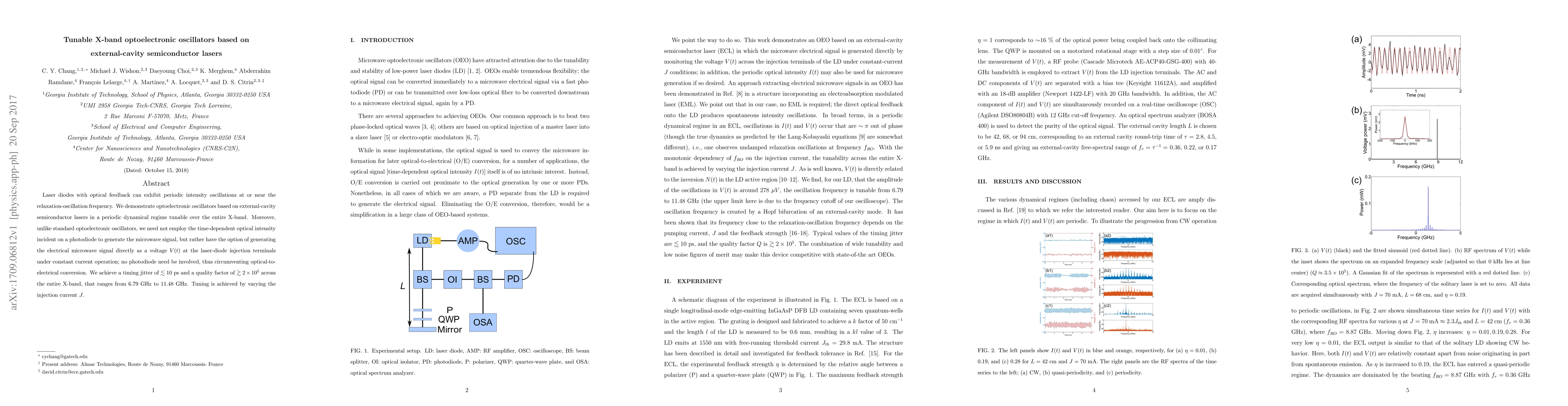This paper demonstrates tunable X-band optoelectronic oscillators using external-cavity semiconductor lasers, achieving microwave signals directly from the laser diode without a photodiode. The oscillators exhibit low timing jitter and high quality factors across the X-band range, with tuning controlled by the injection current.