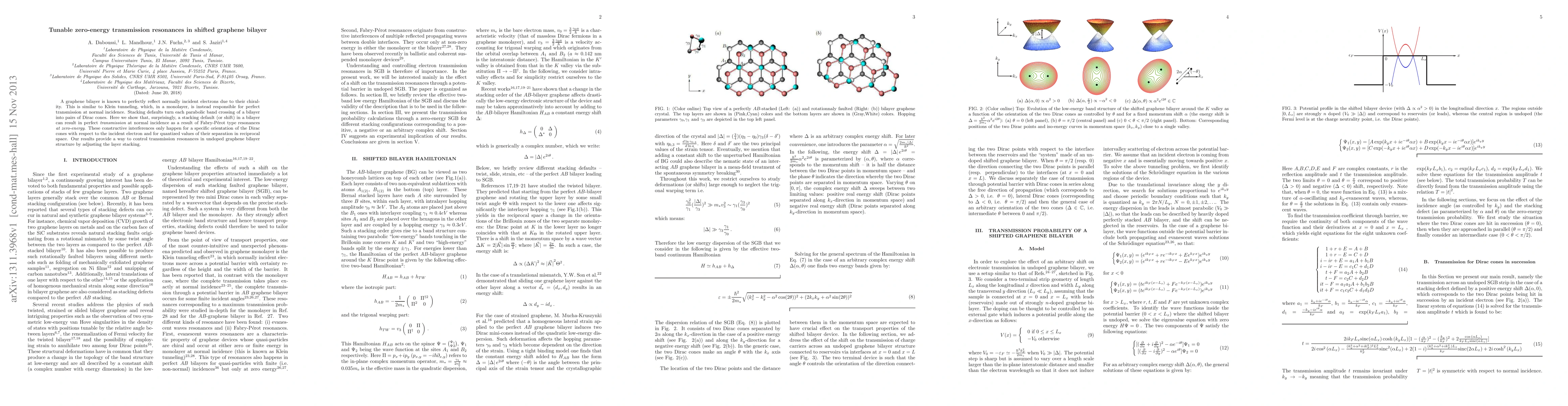 The paper introduces a novel mechanism for zero-energy transmission resonances in shifted graphene bilayers, distinct from those in monolayer and AB-stacked bilayer graphene, and demonstrates their tunability via stacking defect parameters and incidence angle.