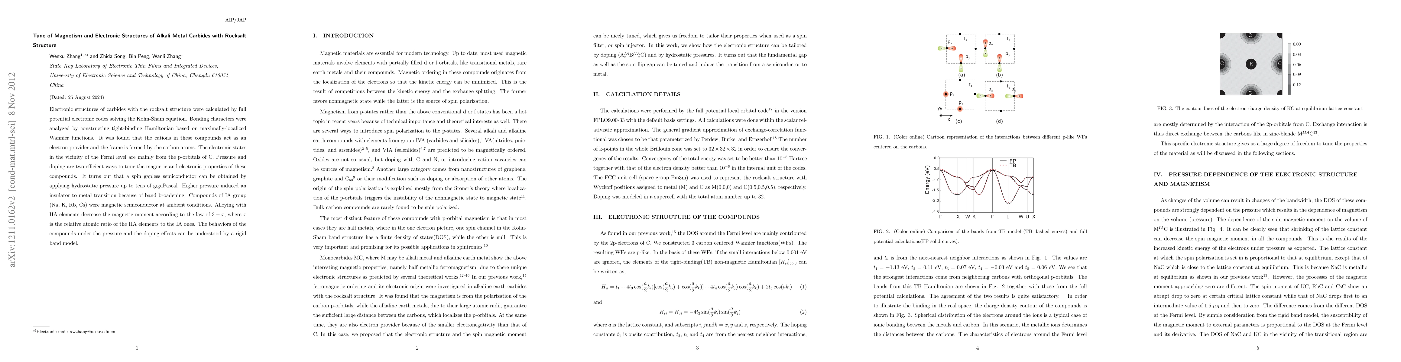 Electronic structures of carbides with the rocksalt structure were calculated by full potential electronic codes solving the Kohn-Sham equation. Bonding characters were analyzed by constructing tight-binding Hamiltonian based on maximally-localized Wannier functions. It was found that the cations in these compounds act as an electron provider and the frame is formed by the carbon atoms. The electronic states in the vicinity of the Fermi level are mainly from the p-orbitals of C. Pressure and doping are two efficient ways to tune the magnetic and electronic properties of these compounds. It turns out that a spin gapless semiconductor can be obtained by applying hydrostatic pressure up to tens of gigaPascal. Higher pressure induced an insulator to metal transition because of band broadening. Compounds of IA group (Na, K, Rb, Cs) were magnetic semiconductor at ambient conditions. Alloying with IIA elements decrease the magnetic moment according to the law of $3-x$, where $x$ is the relative atomic ratio of the IIA elements to the IA ones. The behaviors of the compounds under the pressure and the doping effects can be understood by a rigid band model.
