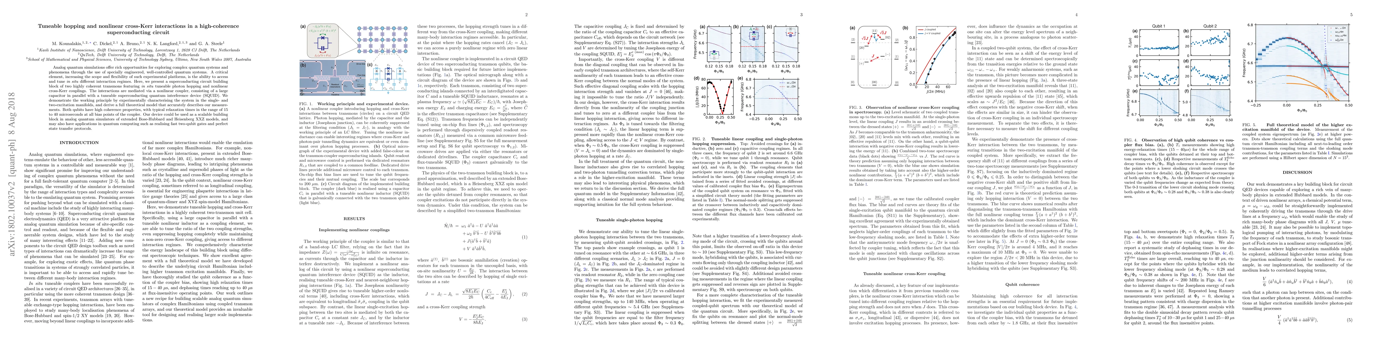 Analog quantum simulations offer rich opportunities for exploring complex quantum systems and phenomena through the use of specially engineered, well-controlled quantum systems. A critical element, increasing the scope and flexibility of such experimental platforms, is the ability to access and tune in situ different interaction regimes. Here, we present a superconducting circuit building block of two highly coherent transmons featuring in situ tuneable photon hopping and nonlinear cross-Kerr couplings. The interactions are mediated via a nonlinear coupler, consisting of a large capacitor in parallel with a tuneable superconducting quantum interference device (SQUID). We demonstrate the working principle by experimentally characterising the system in the single- and two-excitation manifolds, and derive a full theoretical model that accurately describes our measurements. Both qubits have high coherence properties, with typical relaxation times in the range of 15 to 40 microseconds at all bias points of the coupler. Our device could be used as a scalable building block in analog quantum simulators of extended Bose-Hubbard and Heisenberg XXZ models, and may also have applications in quantum computing such as realising fast two-qubit gates and perfect state transfer protocols.