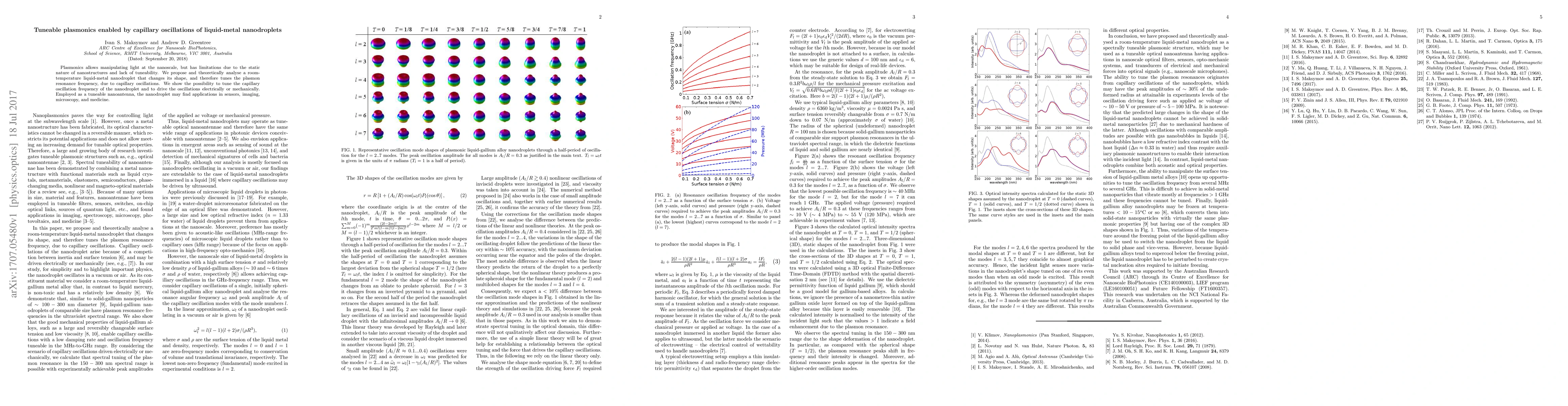 Plasmonics allows manipulating light at the nanoscale, but has limitations due to the static nature of nanostructures and lack of tuneability. We propose and theoretically analyse a room-temperature liquid-metal nanodroplet that changes its shape, and therefore tunes the plasmon resonance frequency, due to capillary oscillations. We show the possibility to tune the capillary oscillation frequency of the nanodroplet and to drive the oscillations electrically or mechanically. Employed as a tuneable nanoantenna, the nanodroplet may find applications in sensors, imaging, microscopy, and medicine.