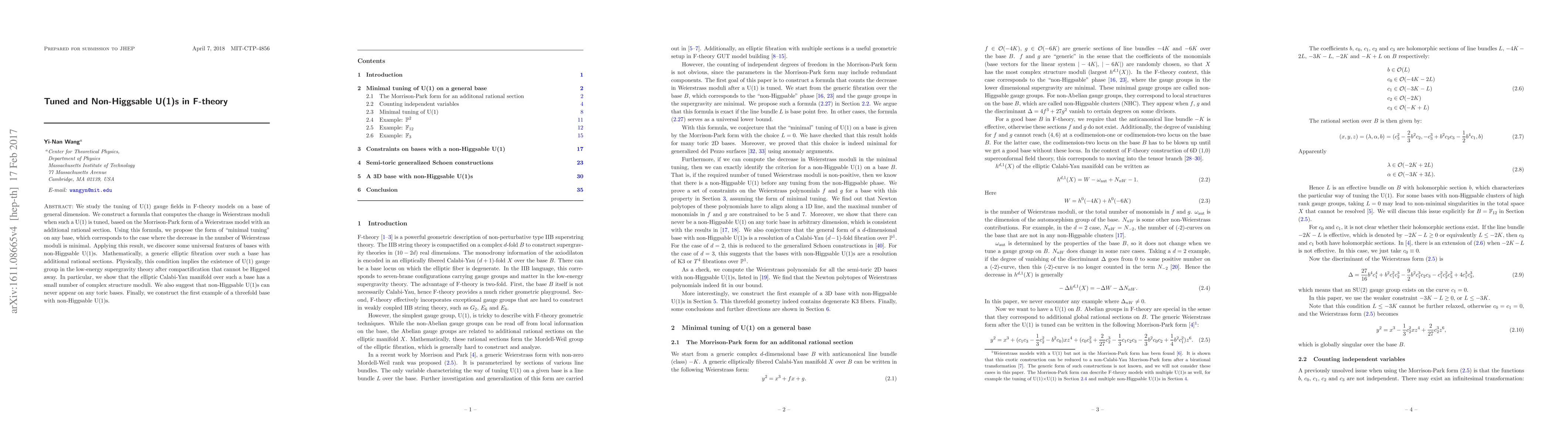 This paper develops a formula to compute changes in Weierstrass moduli when tuning U(1) gauge fields in F-theory models. It identifies "minimal tuning" and reveals universal features of bases with non-Higgsable U(1)s, indicating their persistence in low-energy supergravity theories and a small number of complex structure moduli.