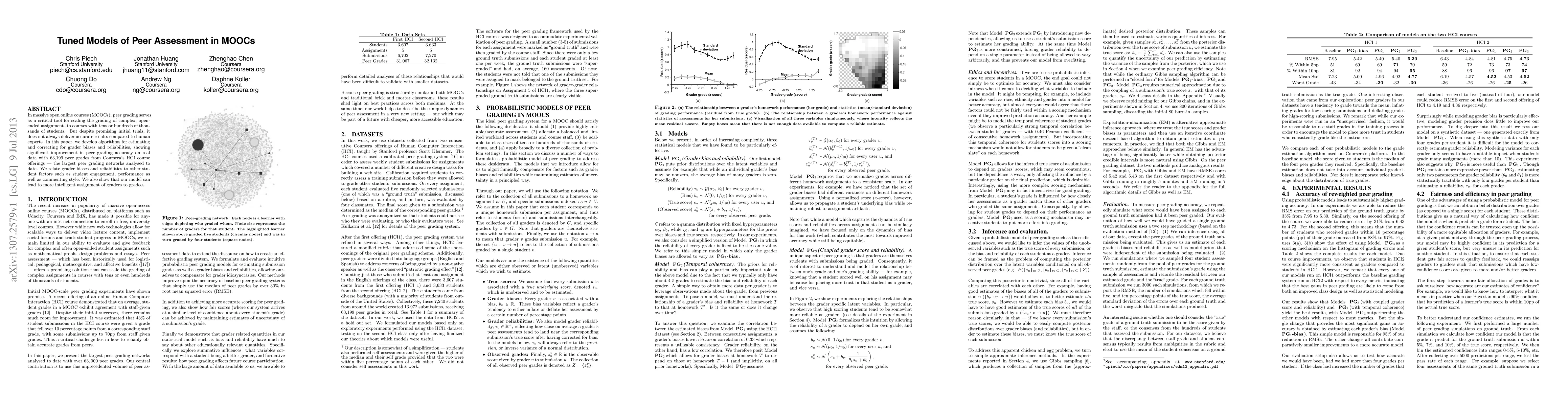 This paper develops algorithms to improve the accuracy of peer grading in MOOCs by estimating and correcting grader biases and reliabilities, achieving significant improvements using data from Coursera's HCI courses. The study also correlates grader biases with student engagement, performance, and commenting style, and proposes a method for more intelligent grader assignment.