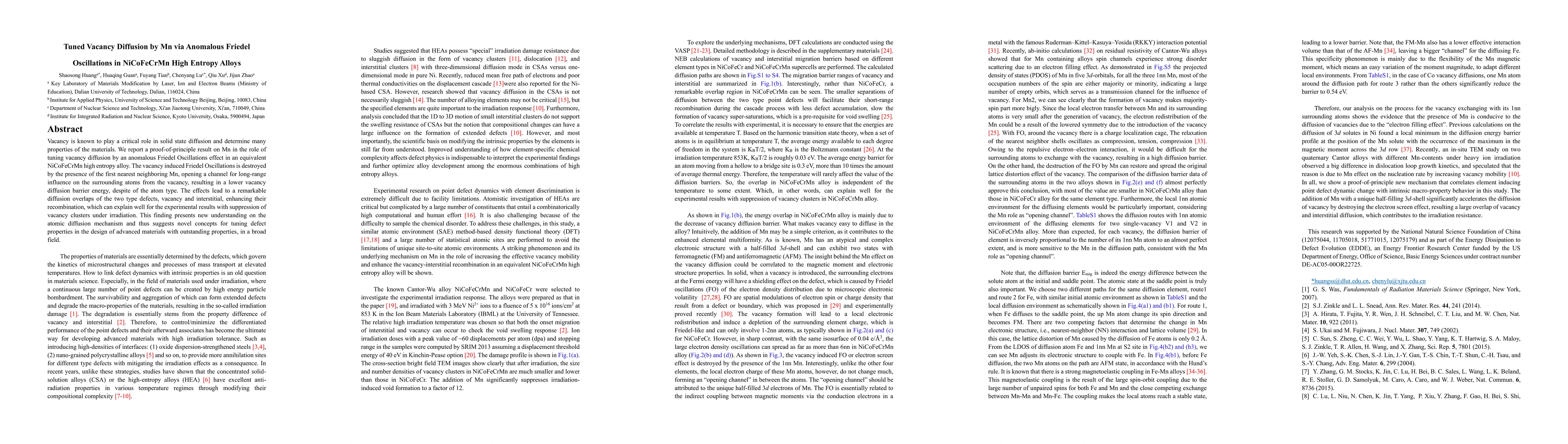 Vacancy is known to play a critical role in solid state diffusion and determine many properties of the materials. We report a proof-of-principle result on Mn in the role of tuning vacancy diffusion by an anomalous Friedel Oscillations effect in an equivalent NiCoFeCrMn high entropy alloy. The vacancy induced Friedel Oscillations is destroyed by the presence of the first nearest neighboring Mn, opening a channel for long-range influence on the surrounding atoms from the vacancy, resulting in a lower vacancy diffusion barrier energy, despite of the atom type. The effects lead to a remarkable diffusion overlaps of the two type defects, vacancy and interstitial, enhancing their recombination, which can explain well for the experimental results with suppression of vacancy clusters under irradiation. This finding presents new understanding on the atomic diffusion mechanism and thus suggests novel concepts for tuning defect properties in the design of advanced materials with outstanding properties, in a broad field.