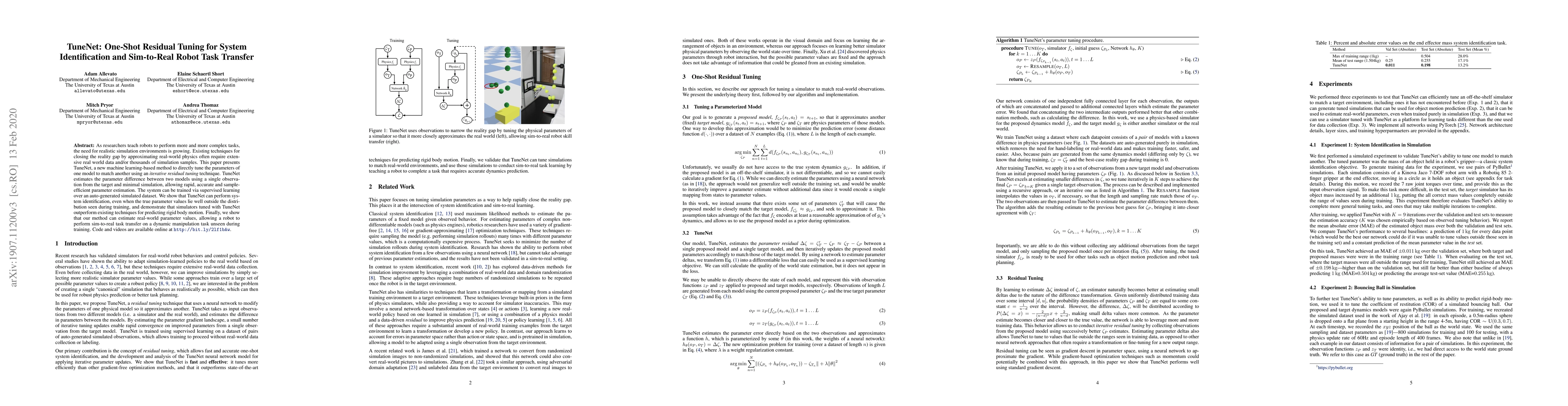 TuneNet introduces a machine learning method for one-shot residual tuning to bridge the reality gap in simulation-to-real robot task transfer, achieving rapid and accurate parameter estimation with minimal data. The system demonstrates superior performance in system identification and sim-to-real task transfer compared to existing techniques.