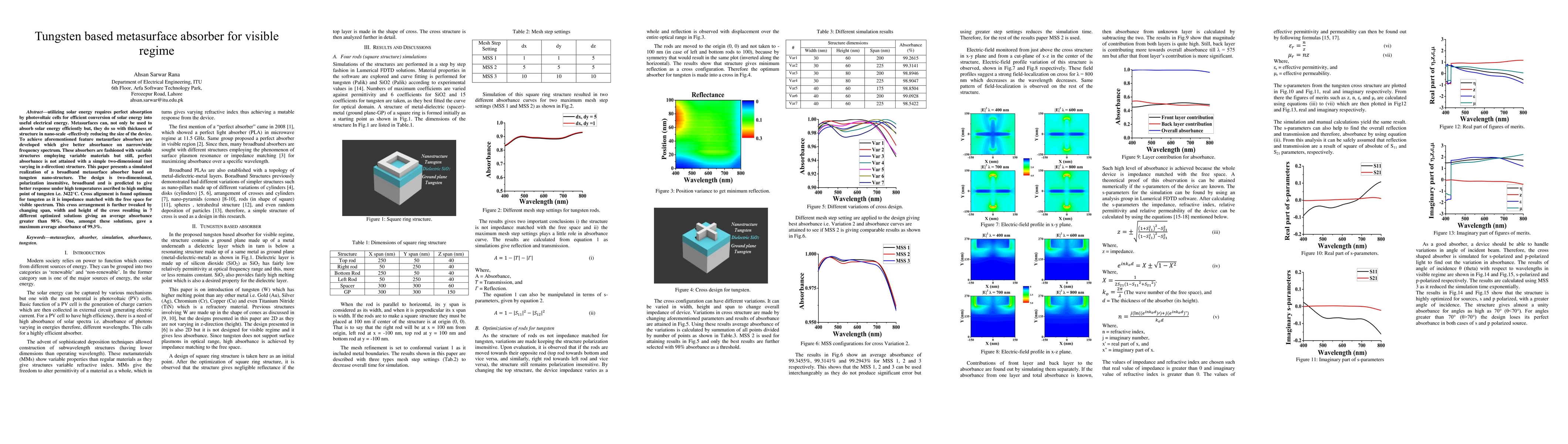 Utilizing solar energy requires perfect absorption by photovoltaic cells for efficient conversion of solar energy into useful electrical energy. Metasurfaces can, not only be used to absorb solar energy efficiently but, they do so with thickness of structure in nano-scale -effectively reducing the size of the device. To achieve aforementioned feature metasurface absorbers are developed which give better absorbance on narrow/wide frequency spectrum. These absorbers are fashioned with variable structures employing variable materials but still, perfect absorbance is not attained with a simple two-dimensional (not varying in z-direction) structure. This paper presents a simulated realization of a broadband metasurface absorber based on tungsten nano-structure. The design is two-dimensional, polarization insensitive, broadband and is predicted to give better response under high temperatures ascribed to high melting point of tungsten i.e. 3422{\deg}C. Cross alignment is found optimum for tungsten as it is impedance matched with the free space for visible spectrum. This cross arrangement is further tweaked by changing span, width and height of the cross resulting in 7 different optimized solutions giving an average absorbance greater than 98%. One, amongst these solutions, gave a maximum average absorbance of 99.3%.
