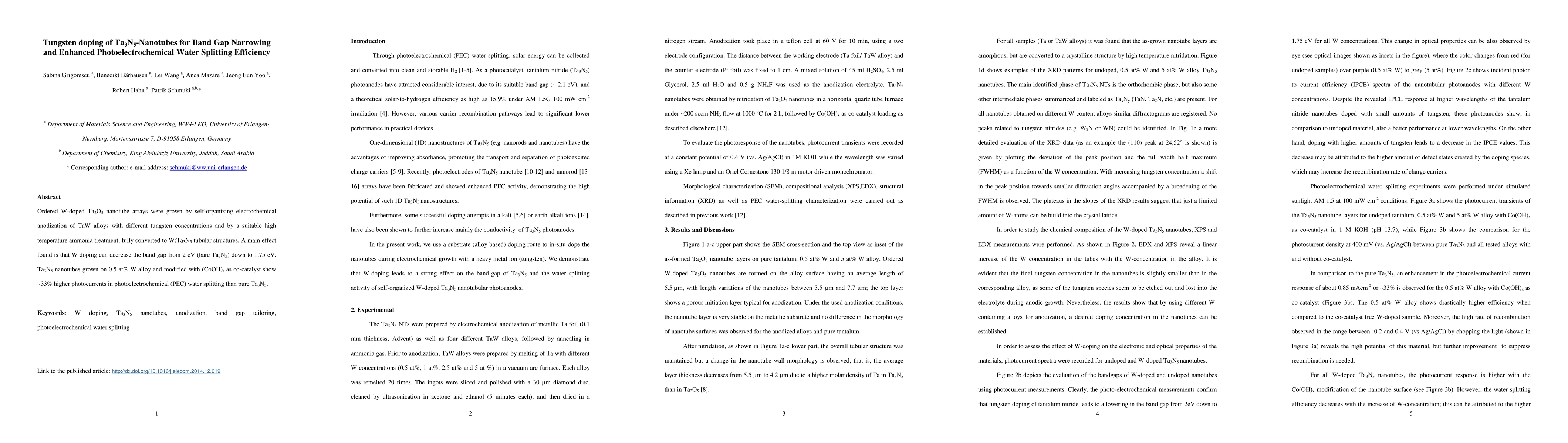 Tungsten doping of Ta3N5 nanotubes narrows the band gap from 2 eV to 1.75 eV, enhancing photoelectrochemical water splitting efficiency by ~33% compared to pure Ta3N5, with optimal performance achieved using 0.5 at% W alloy and Co(OH)x co-catalyst.