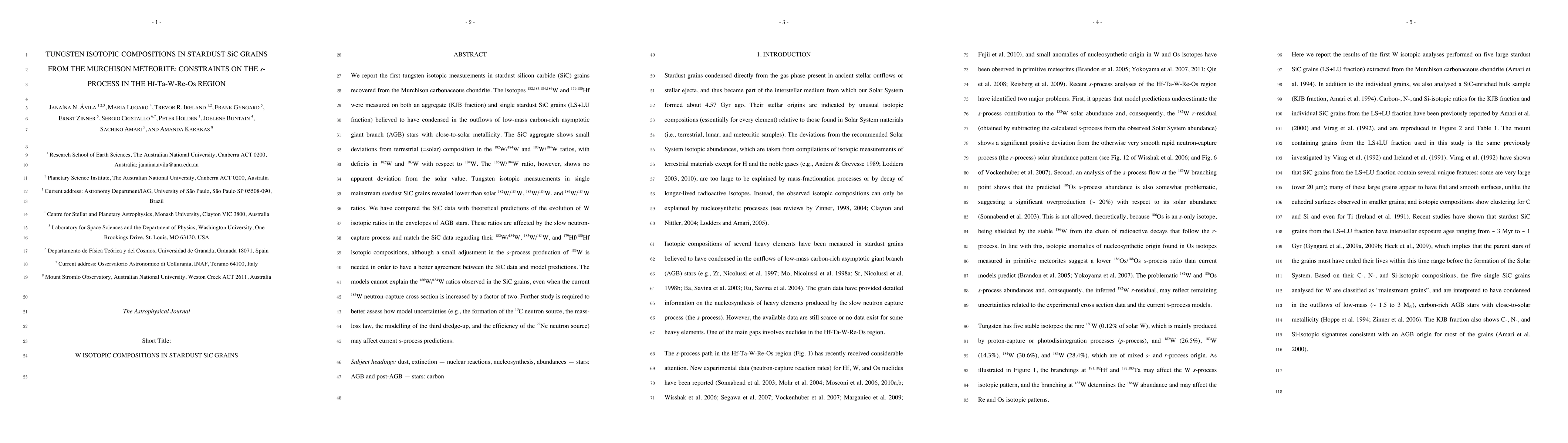 This paper reports tungsten isotopic measurements in stardust silicon carbide grains from the Murchison meteorite, revealing deviations from solar isotopic ratios indicative of the slow neutron-capture process in low-mass carbon-rich asymptotic giant branch stars. The study highlights discrepancies between observed and predicted isotopic ratios, suggesting the need for model refinements to better match observations.