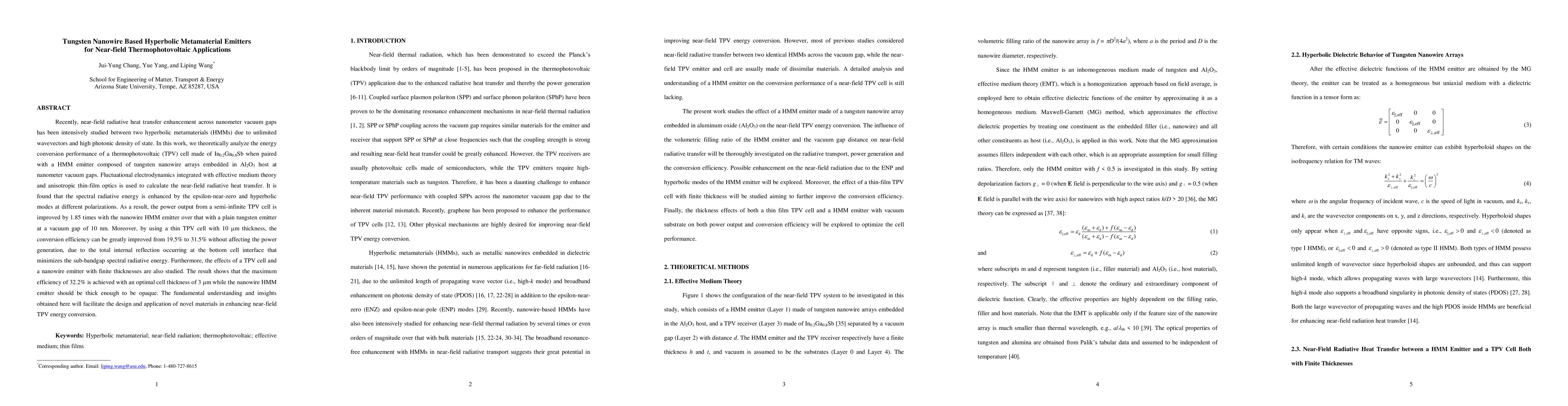 This paper theoretically analyzes the enhanced energy conversion performance of thermophotovoltaic (TPV) cells using tungsten nanowire-based hyperbolic metamaterial (HMM) emitters. The study finds a 1.85-fold improvement in power output and a significant efficiency increase from 19.5% to 31.5% due to near-field radiative heat transfer enhancements, with optimal efficiency of 32.2% achieved under specific conditions.