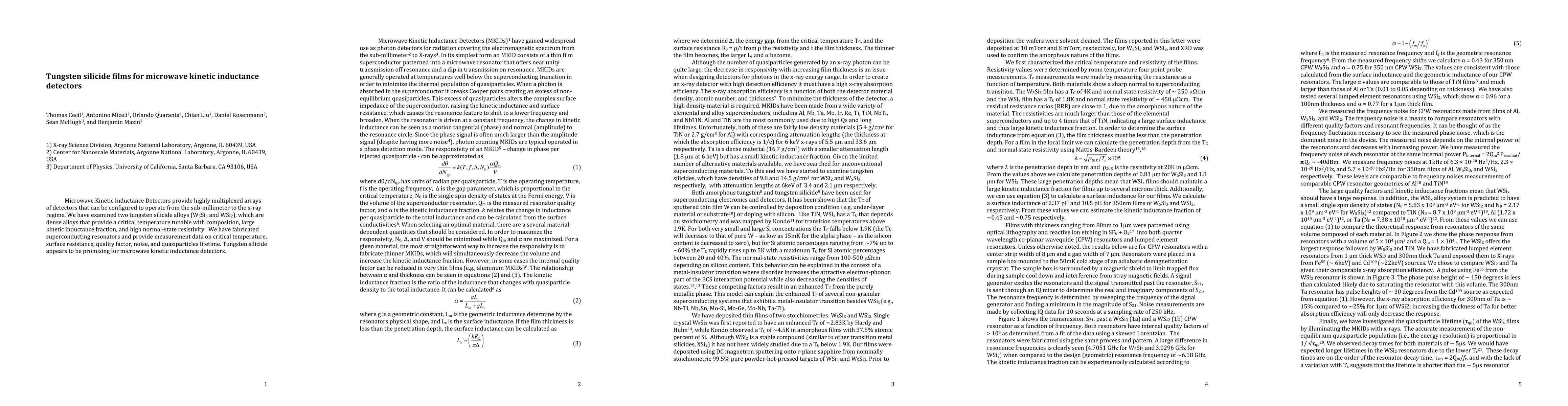 Microwave Kinetic Inductance Detectors (MKIDs) provide highly multiplexed arrays of detectors that can be configured to operate from the sub-millimeter to the X-ray regime. We have examined two tungsten silicide alloys (W5Si3 and WSi2), which are dense alloys that provide a critical temperature tunable with composition, large kinetic inductance fraction, and high normal-state resistivity. We have fabricated superconducting resonators and provide measurement data on critical temperature, surface resistance, quality factor, noise, and quasiparticles lifetime. Tungsten silicide appears to be promising for microwave kinetic inductance detectors.