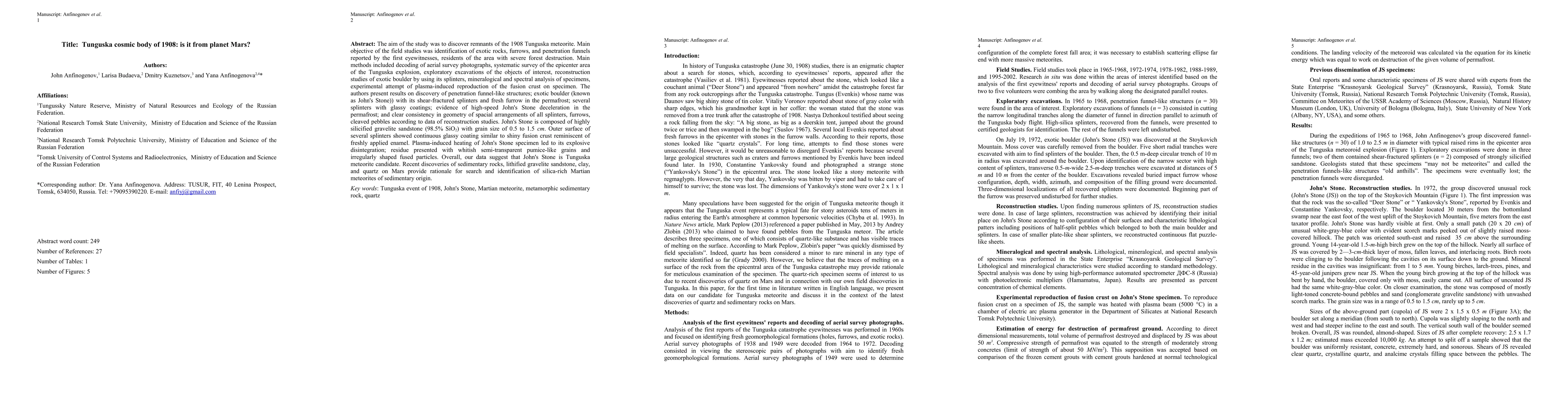 The aim of the study was to discover remnants of the 1908 Tunguska meteorite. Main objective of the field studies was identification of exotic rocks, furrows, and penetration funnels reported by the first eyewitnesses, residents of the area with severe forest destruction. Main methods included decoding of aerial survey photographs, systematic survey of the epicenter area of the Tunguska explosion, exploratory excavations of the objects of interest, reconstruction studies of exotic boulder by using its splinters, mineralogical and spectral analysis of specimens, experimental attempt of plasma-induced reproduction of the fusion crust on specimen. The authors present results on discovery of penetration funnel-like structures; exotic boulder (known as John's Stone)) with its shear-fractured splinters and fresh furrow in the permafrost; several splinters with glassy coatings; evidence of high-speed John's Stone deceleration in the permafrost; and clear consistency in geometry of spacial arrangements of all splinters, furrows, cleaved pebbles according to data of reconstruction studies. John's Stone is composed of highly silicified gravelite sandstone (98.5% SiO2) with grain size of 0.5 to 1.5 cm. Outer surface of several splinters showed continuous glassy coating similar to shiny fusion crust reminiscent of freshly applied enamel. Plasma-induced heating of John's Stone specimen led to its explosive disintegration; residue presented with whitish semi-transparent pumice-like grains and irregularly shaped fused particles. Overall, our data suggest that John's Stone is Tunguska meteorite candidate. Recent discoveries of sedimentary rocks, lithified gravelite sandstone, clay, and quartz on Mars provide rationale for search and identification of silica-rich Martian meteorites of sedimentary origin.