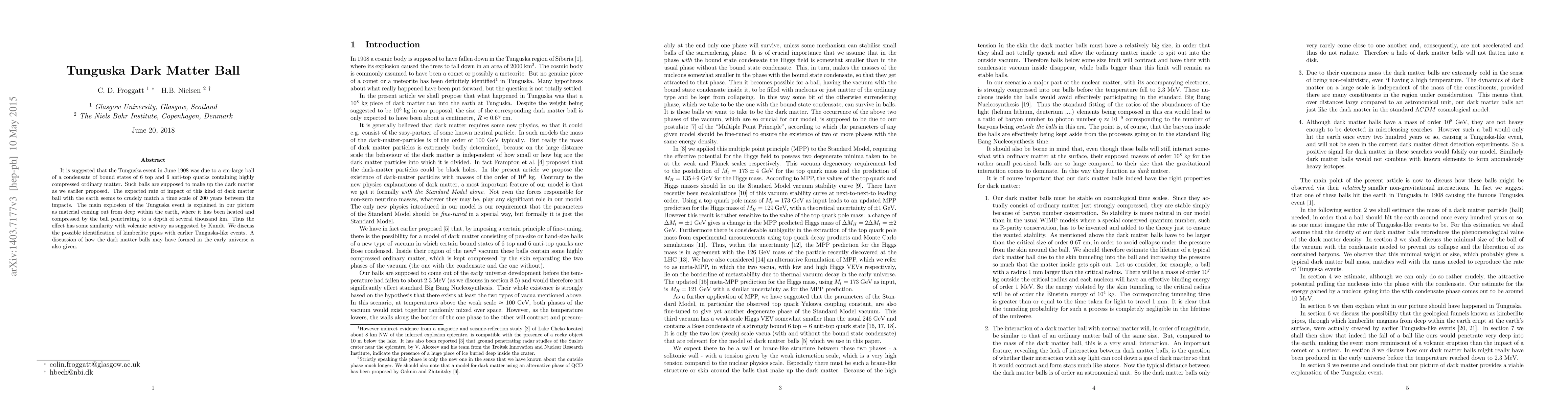 It is suggested that the Tunguska event in June 1908 cm-large was due to a cm-large ball of a condensate of bound states of 6 top and 6 anti-top quarks containing highly compressed ordinary matter. Such balls are supposed to make up the dark matter as we earlier proposed. The expected rate of impact of this kind of dark matter ball with the earth seems to crudely match a time scale of 200 years between the impacts. The main explosion of the Tunguska event is explained in our picture as material coming out from deep within the earth, where it has been heated and compressed by the ball penetrating to a depth of several thousand km. Thus the effect has some similarity with volcanic activity as suggested by Kundt. We discuss the possible identification of kimberlite pipes with earlier Tunguska-like events. A discussion of how the dark matter balls may have formed in the early universe is also given.