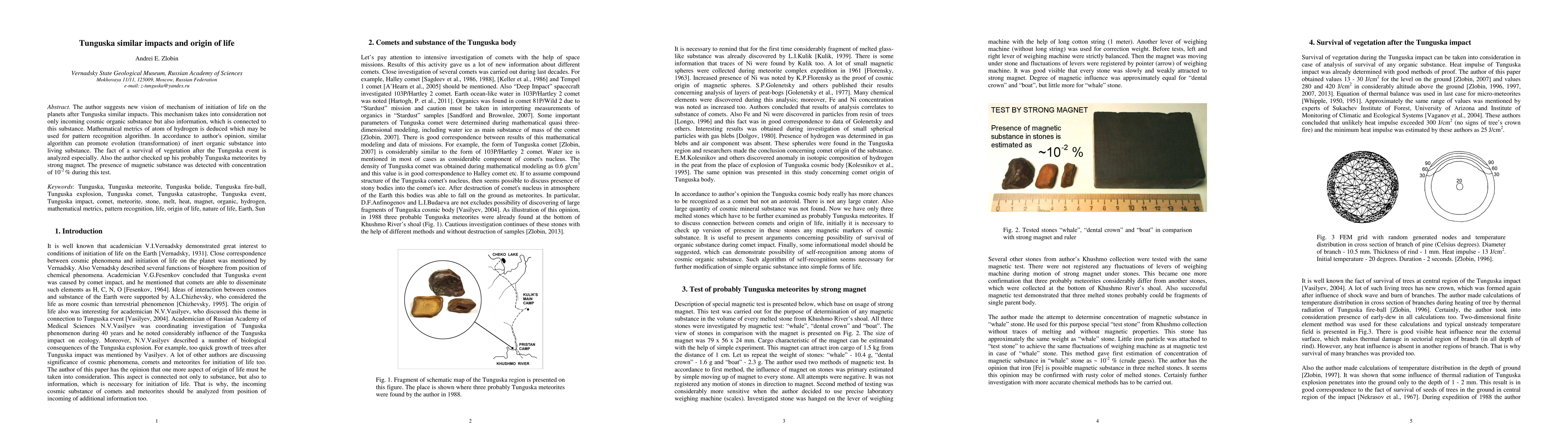 The author suggests new vision of mechanism of initiation of life on the planets after Tunguska similar impacts. This mechanism takes into consideration not only incoming cosmic organic substance but also information, which is connected to this substance. Mathematical metrics of atom of hydrogen is deduced which may be used for pattern recognition algorithm. In accordance to author's opinion, similar algorithm can promote evolution (transformation) of inert organic substance into living substance. The fact of a survival of vegetation after the Tunguska event is analyzed especially. Also the author checked up his probably Tunguska meteorites by strong magnet. The presence of magnetic substance was detected with concentration of 10-2 % during this test.