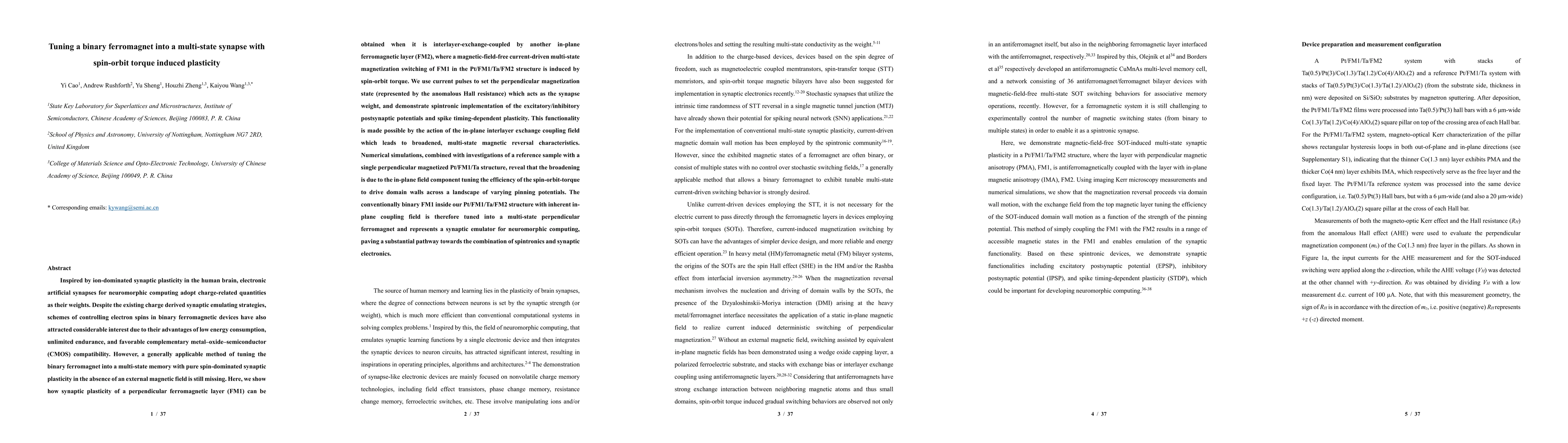 This paper demonstrates a method to transform a binary ferromagnet into a multi-state synapse using spin-orbit torque-induced plasticity, achieved by interlayer-exchange coupling between perpendicular and in-plane ferromagnetic layers. The Pt/FM1/Ta/FM2 structure enables magnetic-field-free, current-driven multi-state switching, emulating synaptic plasticity for neuromorphic computing.