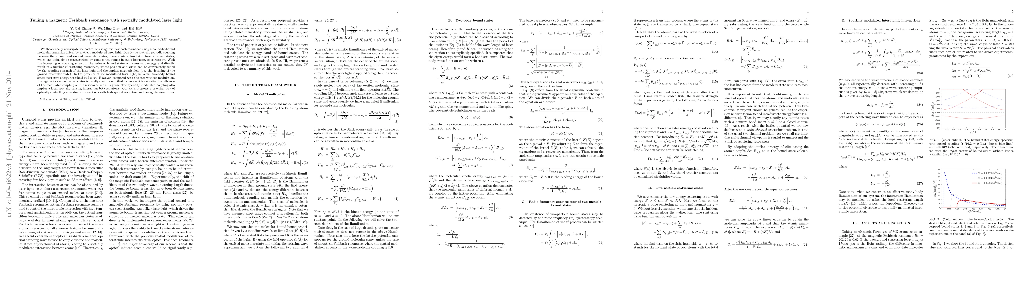 This paper explores the theoretical framework for controlling magnetic Feshbach resonances via spatially modulated laser light, demonstrating how it can tune scattering resonances through varying coupling strength and magnetic field. The method allows for high-resolution, spatially-varying interatomic interactions with minimal atomic loss.