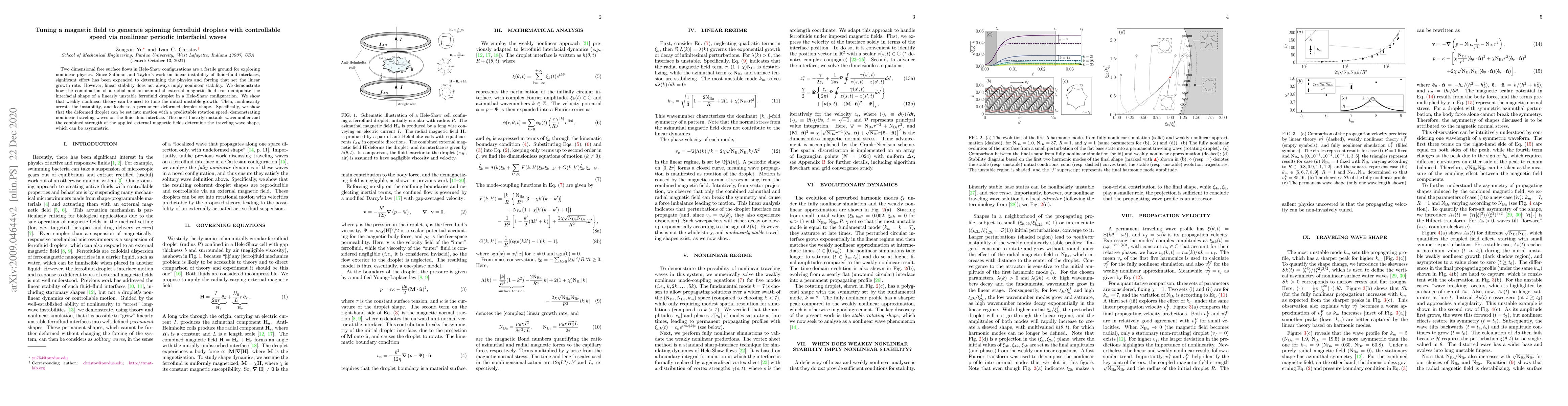 Two dimensional free surface flows in Hele-Shaw configurations are a fertile ground for exploring nonlinear physics. Since Saffman and Taylor's work on linear instability of fluid--fluid interfaces, significant effort has been expended to determining the physics and forcing that set the linear growth rate. However, linear stability does not always imply nonlinear stability. We demonstrate how the combination of a radial and an azimuthal external magnetic field can manipulate the interfacial shape of a linearly unstable ferrofluid droplet in a Hele-Shaw configuration. We show that weakly nonlinear theory can be used to tune the initial unstable growth. Then, nonlinearity arrests the instability, and leads to a permanent deformed droplet shape. Specifically, we show that the deformed droplet can be set into motion with a predictable rotation speed, demonstrating nonlinear traveling waves on the fluid-fluid interface. The most linearly unstable wavenumber and the combined strength of the applied external magnetic fields determine the traveling wave shape, which can be asymmetric.