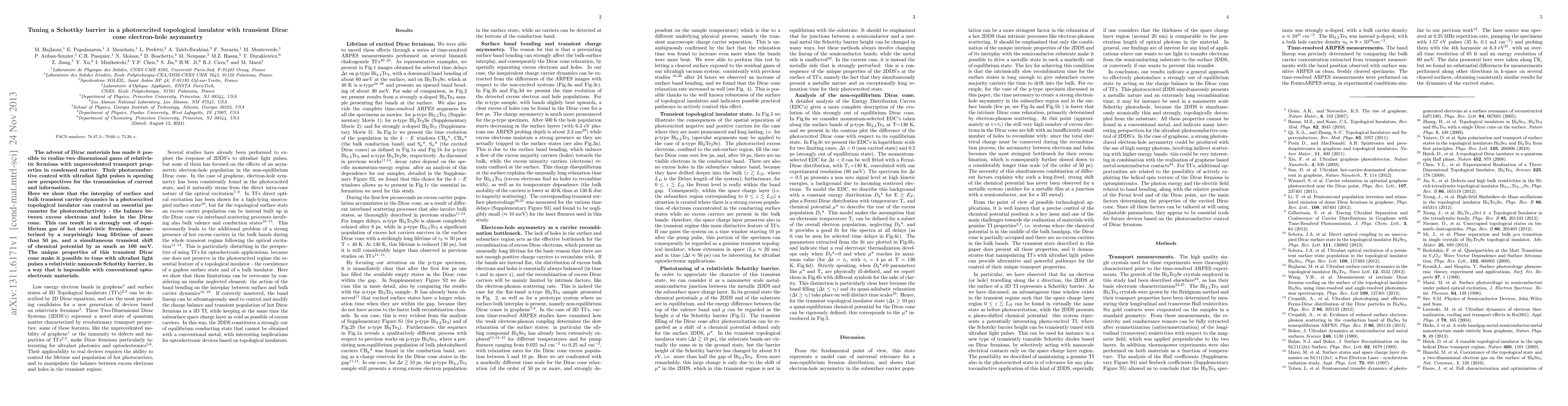 The advent of Dirac materials has made it possible to realize two dimensional gases of relativistic fermions with unprecedented transport properties in condensed matter. Their photoconductive control with ultrafast light pulses is opening new perspectives for the transmission of current and information. Here we show that the interplay of surface and bulk transient carrier dynamics in a photoexcited topological insulator can control an essential parameter for photoconductivity - the balance between excess electrons and holes in the Dirac cone. This can result in a strongly out of equilibrium gas of hot relativistic fermions, characterized by a surprisingly long lifetime of more than 50 ps, and a simultaneous transient shift of chemical potential by as much as 100 meV. The unique properties of this transient Dirac cone make it possible to tune with ultrafast light pulses a relativistic nanoscale Schottky barrier, in a way that is impossible with conventional optoelectronic materials.