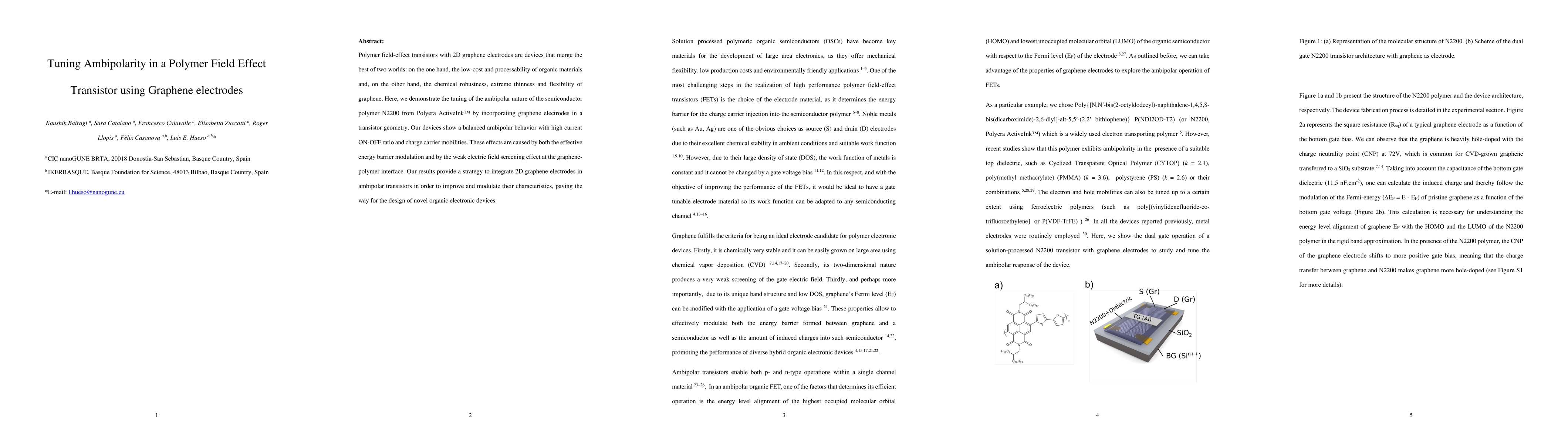This paper demonstrates how incorporating graphene electrodes into polymer field-effect transistors can tune the ambipolar behavior of the semiconductor polymer N2200, achieving a balanced ambipolar behavior with high current ON-OFF ratios and charge carrier mobilities. The effects are attributed to energy barrier modulation and weak electric field screening at the graphene-polymer interface.