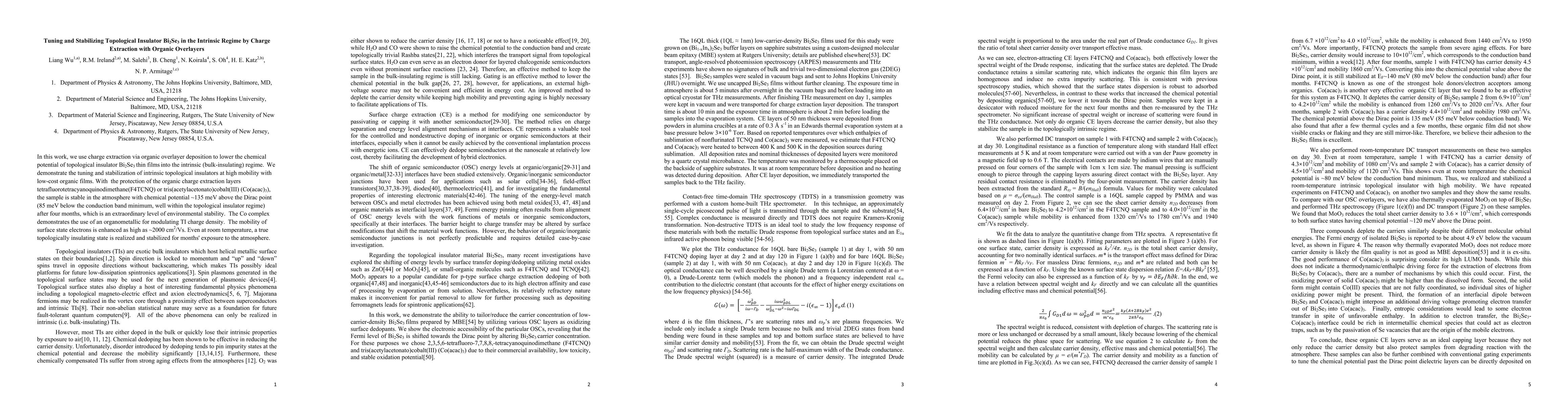 This paper demonstrates the use of organic overlayers to tune and stabilize Bi2Se3 topological insulators into the intrinsic regime, achieving high mobility and environmental stability. The use of tetrafluorotetracyanoquinodimethane or tris(acetylacetonato)cobalt(III) for charge extraction maintains the chemical potential well within the topological insulator regime, with electron mobility enhanced to ~2000 cm2/Vs.