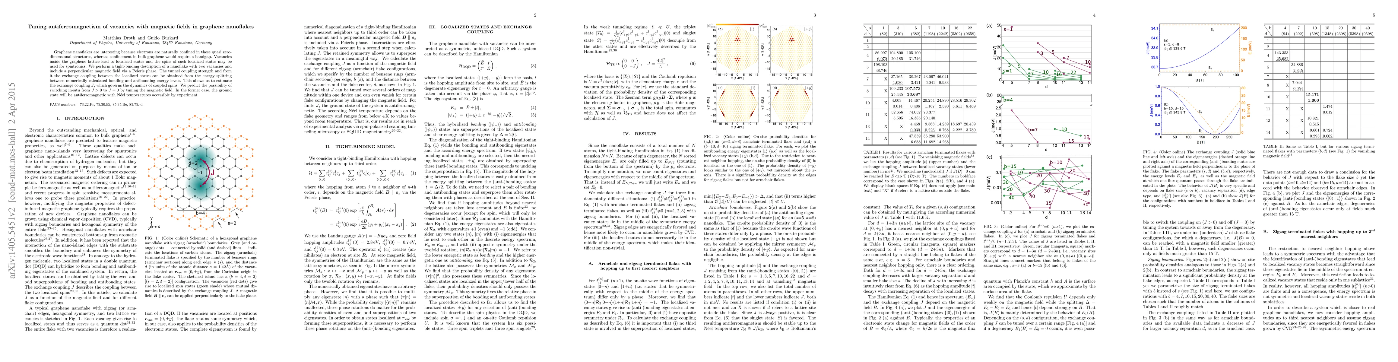 Graphene nanoflakes are interesting because electrons are naturally confined in these quasi-zero-dimensional structures, whereas confinement in bulk graphene would require a band gap. Vacancies inside the graphene lattice lead to localized states and the spins of such localized states may be used for spintronics. We perform a tight-binding description of a nanoflake with two vacancies and include a perpendicular magnetic field via a Peierls phase. The tunnel coupling strength and from it the exchange coupling between the localized states can be obtained from the energy splitting between numerically calculated bonding and antibonding energy levels. This allows us to estimate the exchange coupling J, which governs the dynamics of coupled spins. We predict the possibility of switching in situ from J>0 to J=0 by tuning the magnetic field. In the former case, the ground state will be antiferromagnetic with N\'eel temperatures accessible by experiment.