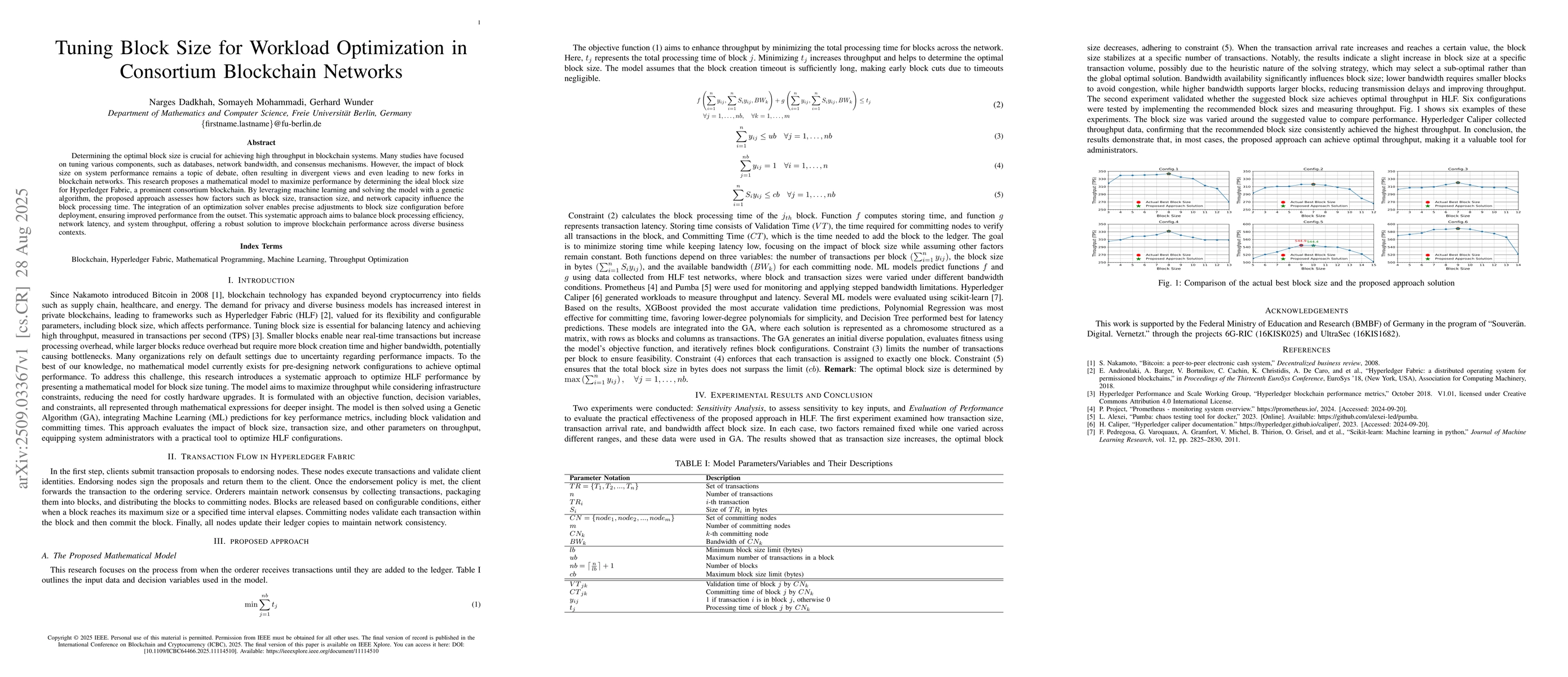 Determining the optimal block size is crucial for achieving high throughput in blockchain systems. Many studies have focused on tuning various components, such as databases, network bandwidth, and consensus mechanisms. However, the impact of block size on system performance remains a topic of debate, often resulting in divergent views and even leading to new forks in blockchain networks. This research proposes a mathematical model to maximize performance by determining the ideal block size for Hyperledger Fabric, a prominent consortium blockchain. By leveraging machine learning and solving the model with a genetic algorithm, the proposed approach assesses how factors such as block size, transaction size, and network capacity influence the block processing time. The integration of an optimization solver enables precise adjustments to block size configuration before deployment, ensuring improved performance from the outset. This systematic approach aims to balance block processing efficiency, network latency, and system throughput, offering a robust solution to improve blockchain performance across diverse business contexts.