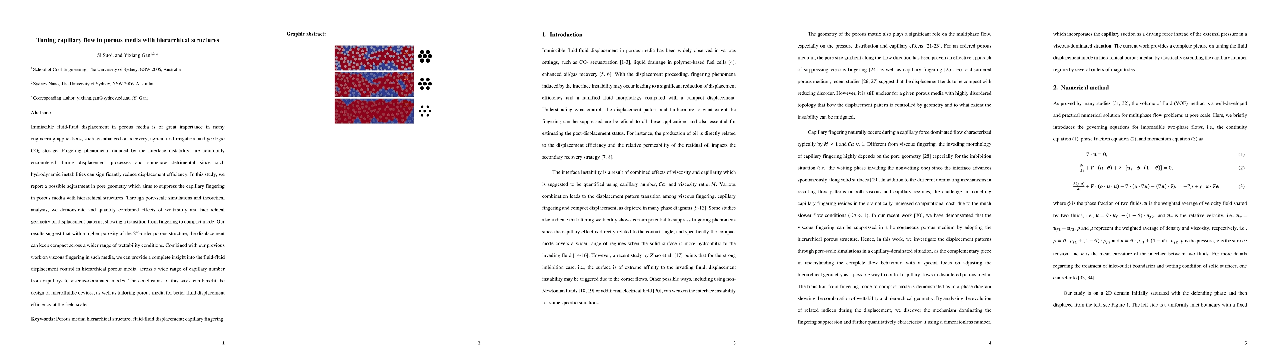 This study investigates the suppression of capillary fingering in hierarchical porous media through pore geometry adjustments, demonstrating a transition from fingering to compact displacement patterns via simulations and theoretical analysis. The findings suggest that higher porosity in second-order structures can maintain compact displacement across varied wettability conditions, enhancing fluid-fluid displacement efficiency in applications like enhanced oil recovery.