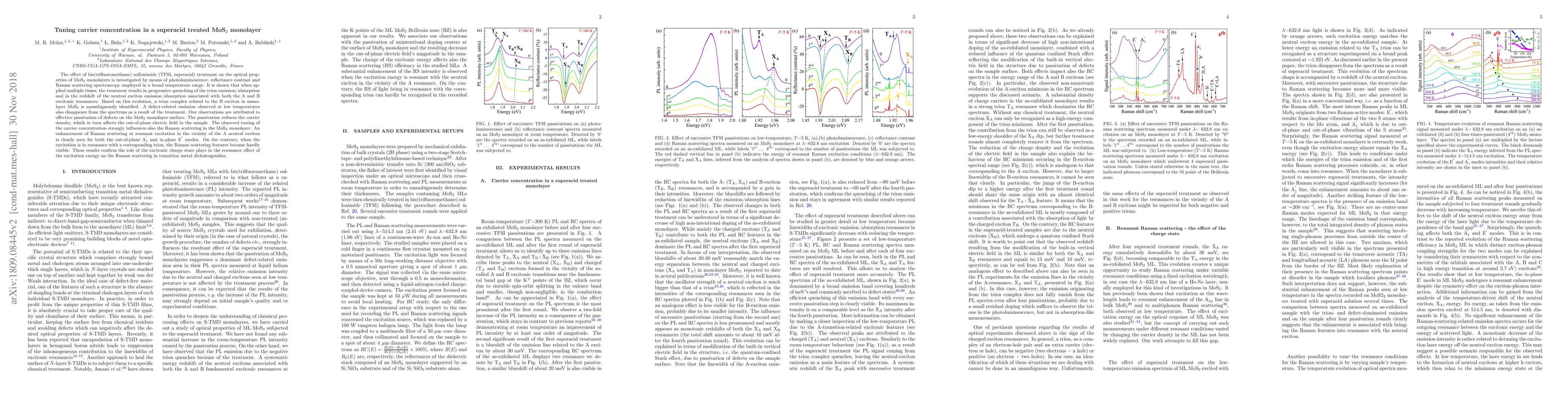 This research investigates the impact of superacid (TFSI) treatment on MoS$_2$ monolayers, showing that repeated treatment results in reduced carrier density and affects optical properties, including redshift of exciton emissions and quenching of trion emissions. The study reveals effective defect passivation and significant modulation of Raman scattering due to changes in carrier concentration.