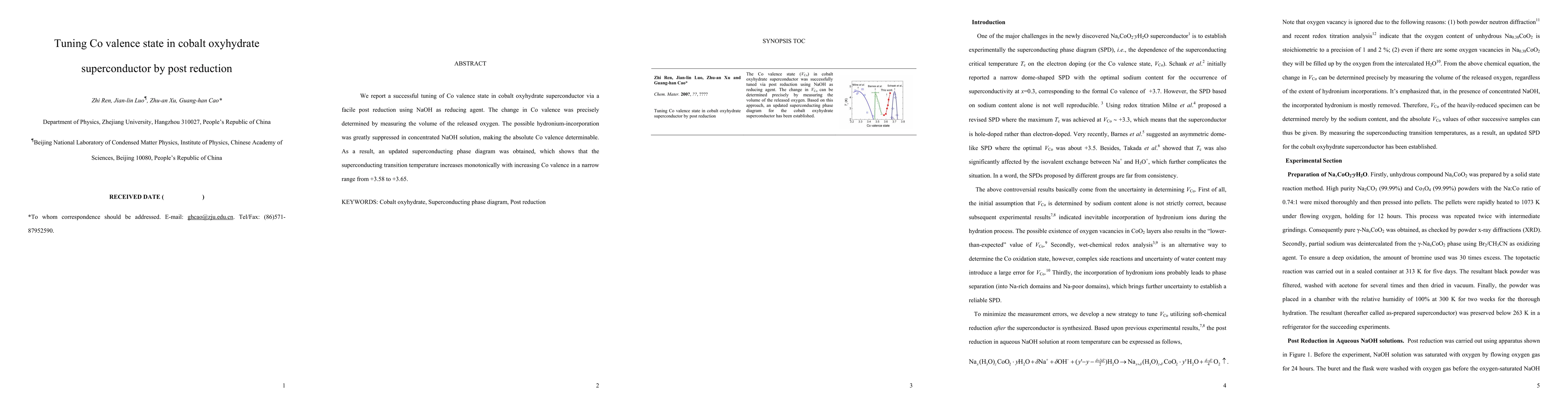 This study successfully tunes the Co valence state in cobalt oxyhydrate superconductors through post-reduction with NaOH, precisely measuring the released oxygen to determine Co valence changes. The enhanced superconducting transition temperature correlates with increased Co valence in a narrow range from +3.58 to +3.65.