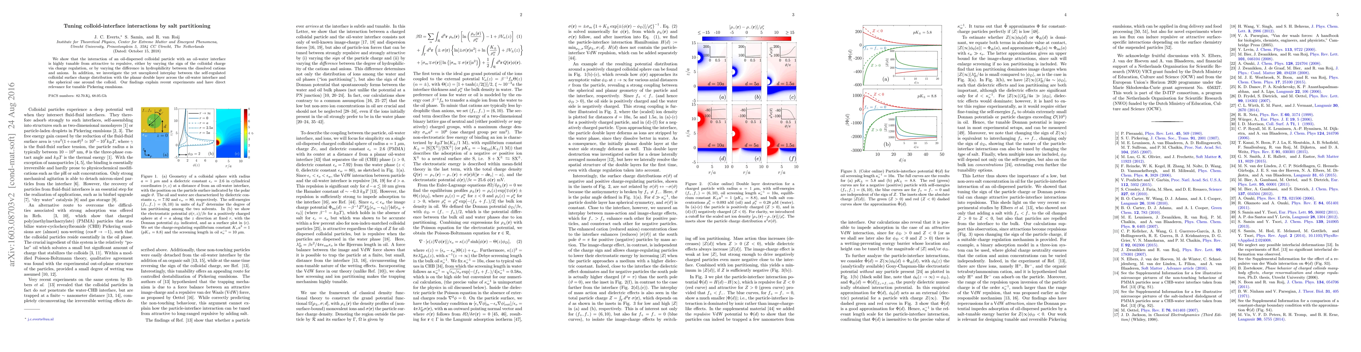 This paper demonstrates how colloid-interface interactions can be tuned from attractive to repulsive by adjusting colloidal charge or salt partitioning, revealing the interplay between self-regulated colloidal surface charge and the double layer across an oil-water interface. These findings have implications for the development of tunable Pickering emulsions.