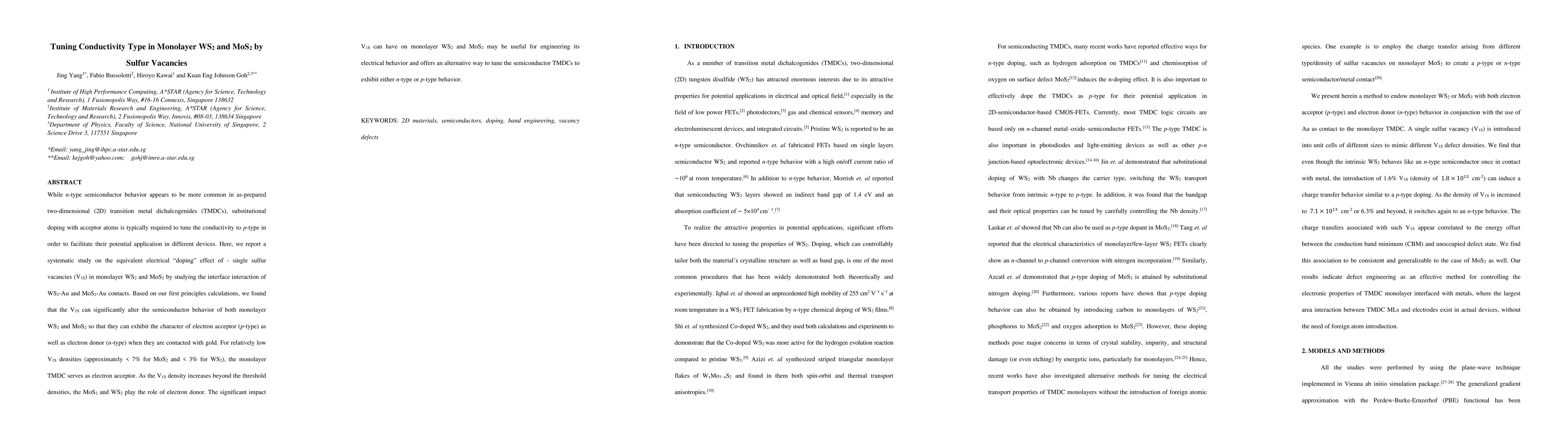 This study reveals that sulfur vacancies in monolayer WS2 and MoS2 can induce p-type or n-type behavior by altering their interface interaction with gold, offering a novel method for tuning the electrical conductivity of these two-dimensional semiconductors without substitutional doping.