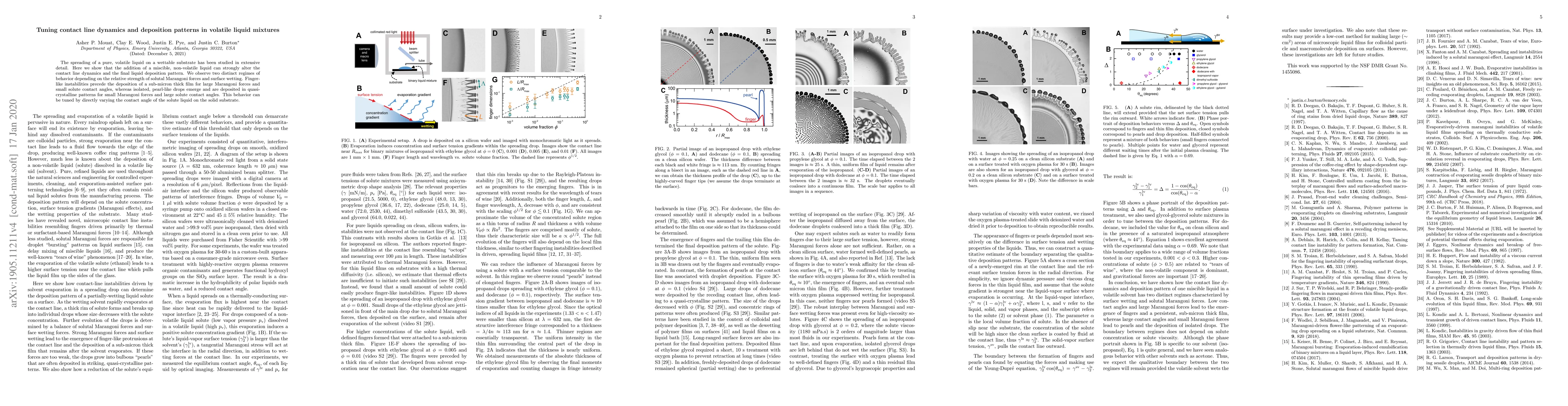 The spreading of a pure, volatile liquid on a wettable substrate has been studied in extensive detail. Here we show that the addition of a miscible, non-volatile liquid can strongly alter the contact line dynamics and the final liquid deposition pattern. We observe two distinct regimes of behavior depending on the relative strength of solutal Marangoni forces and surface wetting. Finger-like instabilities precede the deposition of a sub-micron thick film for large Marangoni forces and small solute contact angles, whereas isolated, pearl-like drops emerge and are deposited in quasi-crystalline patterns for small Marangoni forces and large solute contact angles. This behavior can be tuned by directly varying the contact angle of the solute liquid on the solid substrate.