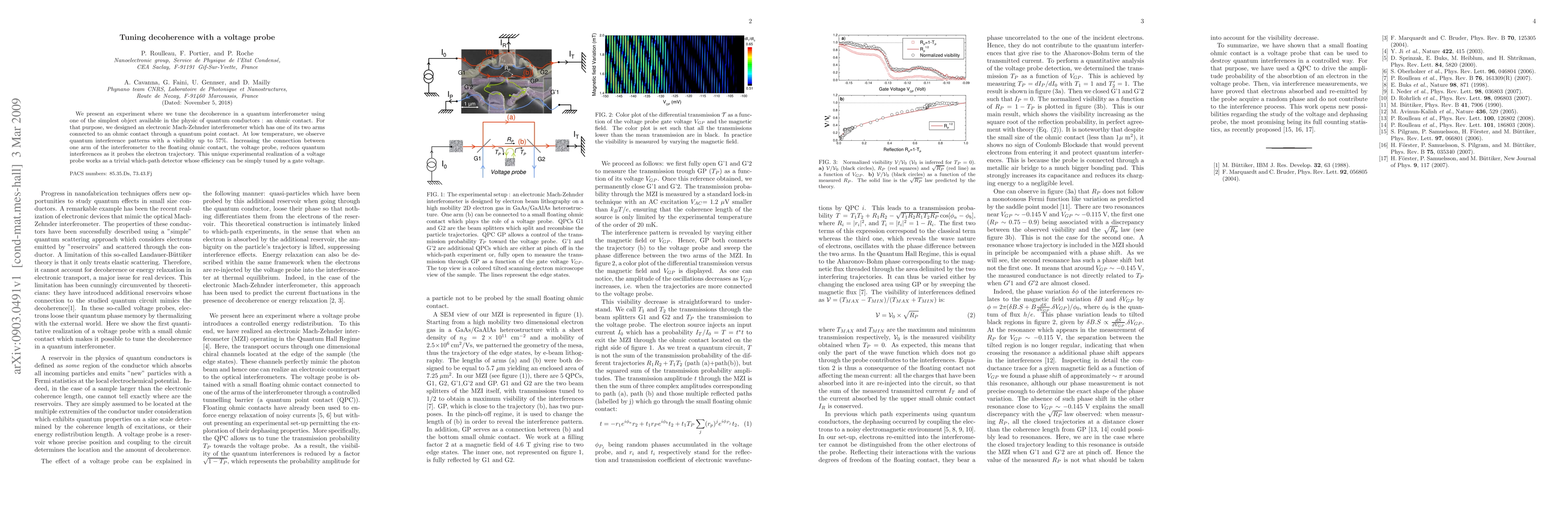 We present an experiment where we tune the decoherence in a quantum interferometer using one of the simplest object available in the physic of quantum conductors : an ohmic contact. For that purpose, we designed an electronic Mach-Zehnder interferometer which has one of its two arms connected to an ohmic contact through a quantum point contact. At low temperature, we observe quantum interference patterns with a visibility up to 57%. Increasing the connection between one arm of the interferometer to the floating ohmic contact, the voltage probe, reduces quantum interferences as it probes the electron trajectory. This unique experimental realization of a voltage probe works as a trivial which-path detector whose efficiency can be simply tuned by a gate voltage.
