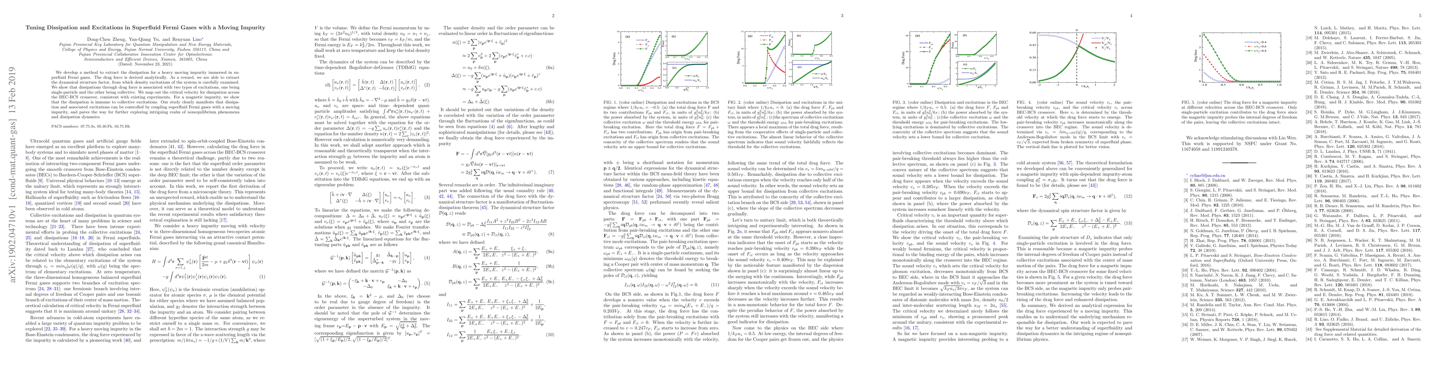 This paper develops a method to analyze dissipation and excitations in superfluid Fermi gases with a moving impurity, deriving the drag force and examining the dynamical structure factor. It reveals two types of excitations—single-particle and collective—and maps out the critical velocity for dissipation across the BEC-BCS crossover, demonstrating control over dissipation dynamics through impurity motion.