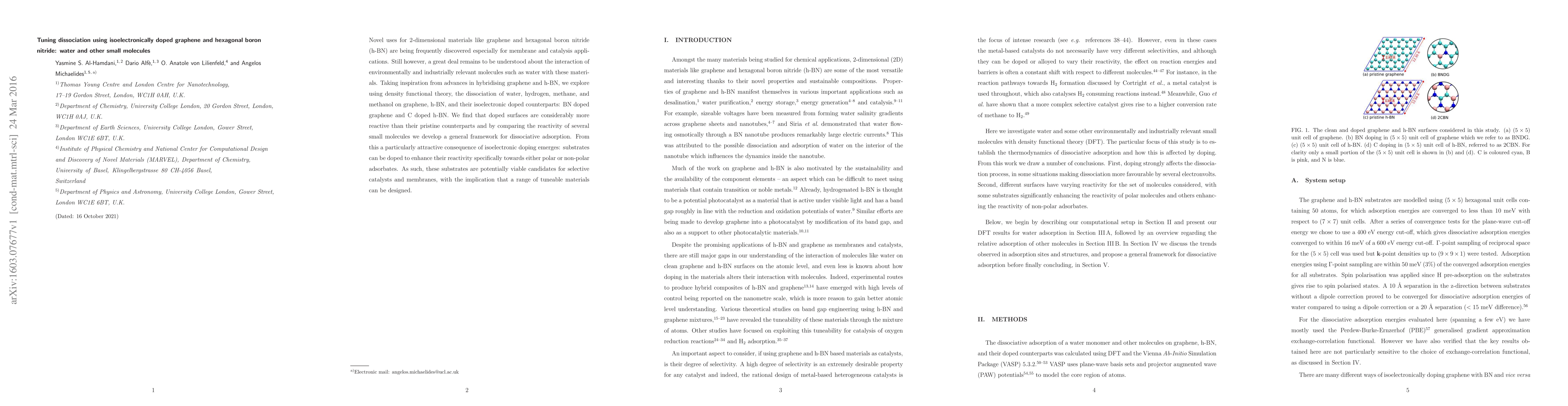 This paper investigates the enhanced reactivity of doped graphene and hexagonal boron nitride (h-BN) for the dissociation of water and other small molecules using density functional theory. The study reveals that isoelectronic doping significantly increases the reactivity of these materials, enabling selective catalysis and membrane applications.