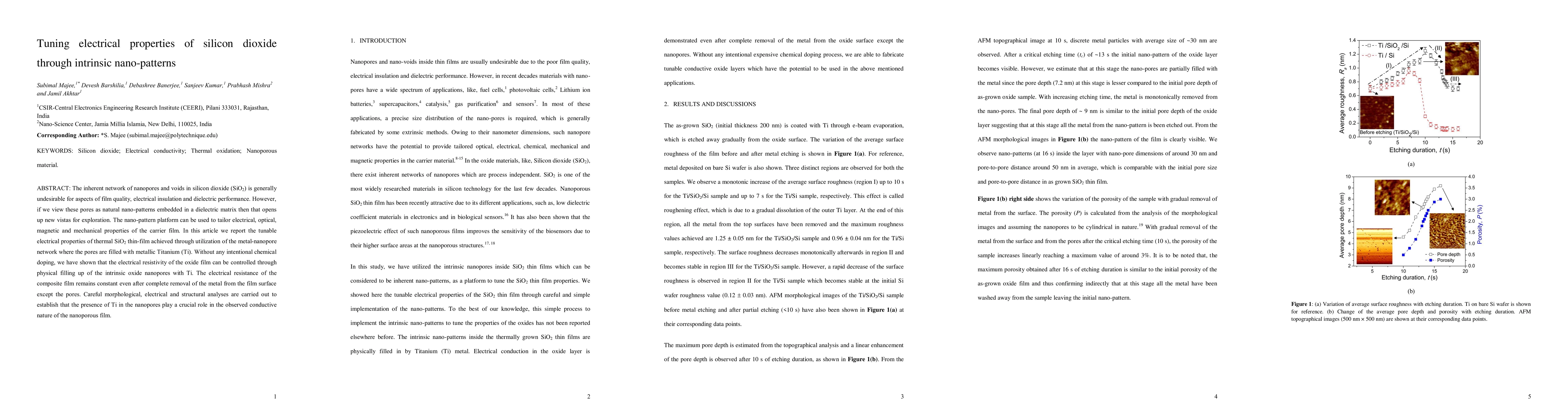 This paper explores how intrinsic nano-patterns in silicon dioxide can be tuned to control electrical properties by filling its nanopores with metallic titanium, achieving tunable electrical resistivity without chemical doping. The study demonstrates the conductive nature of the composite film due to Ti in the nanopores, maintaining resistance even after metal removal from the surface.