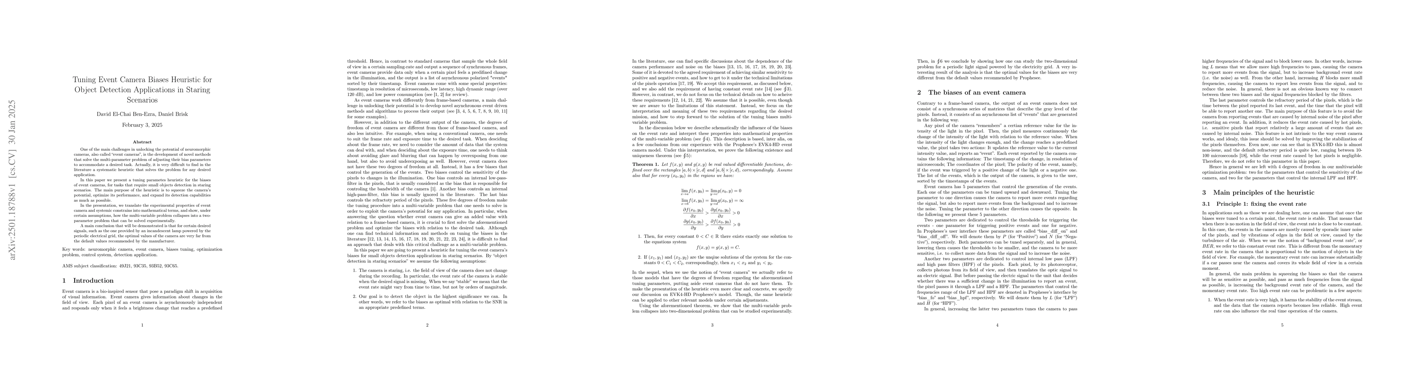 The paper presents a heuristic for tuning bias parameters of event cameras for small object detection in staring scenarios, translating camera properties into mathematical terms to simplify the multi-parameter problem into a two-parameter problem.